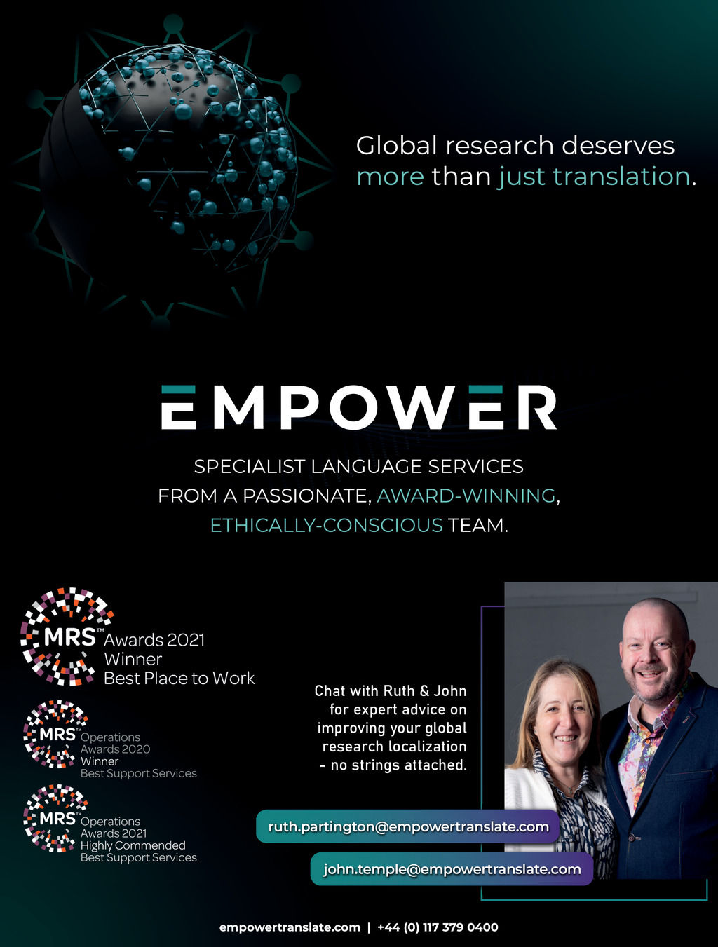 Global research deserves more than just translation. SPECIALIST LANGUAGE SERVICES FROM A PASSIONATE, AWARD-WINNING, ETHICALLY-CONSCIOUS TEAM. Chat with Ruth & John for expert advice on improving your global research localization - no strings attached. ruth.partington@empowertranslate.com john.temple@empowertranslate.com empowertranslate.com | +44 (0) 117 379 0400 Impact ISSUE 38 2022_pp8-9_WV intro.indd 8 22/06/2022 14:43