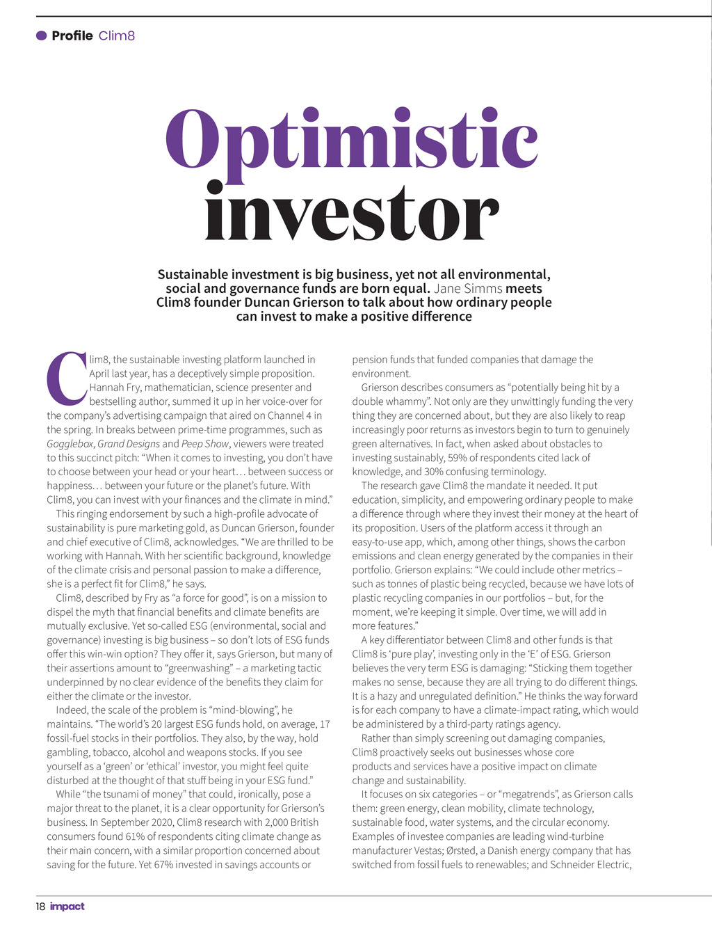 Profile Clim8 Optimistic investor Sustainable investment is big business, yet not all environmental, social and governance funds are born equal. Jane Simms meets Clim8 founder Duncan Grierson to talk about how ordinary people can invest to make a positive difference C lim8, the sustainable investing platform launched in April last year, has a deceptively simple proposition. Hannah Fry, mathematician, science presenter and bestselling author, summed it up in her voice-over for the companys advertising campaign that aired on Channel 4 in the spring. In breaks between prime-time programmes, such as Gogglebox, Grand Designs and Peep Show, viewers were treated to this succinct pitch: When it comes to investing, you dont have to choose between your head or your heart between success or happiness between your future or the planets future. With Clim8, you can invest with your finances and the climate in mind. This ringing endorsement by such a high-profile advocate of sustainability is pure marketing gold, as Duncan Grierson, founder and chief executive of Clim8, acknowledges. We are thrilled to be working with Hannah. With her scientific background, knowledge of the climate crisis and personal passion to make a difference, she is a perfect fit for Clim8, he says. Clim8, described by Fry as a force for good, is on a mission to dispel the myth that financial benefits and climate benefits are mutually exclusive. Yet so-called ESG (environmental, social and governance) investing is big business so dont lots of ESG funds offer this win-win option? They offer it, says Grierson, but many of their assertions amount to greenwashing a marketing tactic underpinned by no clear evidence of the benefits they claim for either the climate or the investor. Indeed, the scale of the problem is mind-blowing, he maintains. The worlds 20 largest ESG funds hold, on average, 17 fossil-fuel stocks in their portfolios. They also, by the way, hold gambling, tobacco, alcohol and weapons stocks. If you see yourself as a green or ethical investor, you might feel quite disturbed at the thought of that stuff being in your ESG fund. While the tsunami of money that could, ironically, pose a major threat to the planet, it is a clear opportunity for Griersons business. In September 2020, Clim8 research with 2,000 British consumers found 61% of respondents citing climate change as their main concern, with a similar proportion concerned about saving for the future. Yet 67% invested in savings accounts or pension funds that funded companies that damage the environment. Grierson describes consumers as potentially being hit by a double whammy. Not only are they unwittingly funding the very thing they are concerned about, but they are also likely to reap increasingly poor returns as investors begin to turn to genuinely green alternatives. In fact, when asked about obstacles to investing sustainably, 59% of respondents cited lack of knowledge, and 30% confusing terminology. The research gave Clim8 the mandate it needed. It put education, simplicity, and empowering ordinary people to make a difference through where they invest their money at the heart of its proposition. Users of the platform access it through an easy-to-use app, which, among other things, shows the carbon emissions and clean energy generated by the companies in their portfolio. Grierson explains: We could include other metrics such as tonnes of plastic being recycled, because we have lots of plastic recycling companies in our portfolios but, for the moment, were keeping it simple. Over time, we will add in more features. A key differentiator between Clim8 and other funds is that Clim8 is pure play, investing only in the E of ESG. Grierson believes the very term ESG is damaging: Sticking them together makes no sense, because they are all trying to do different things. It is a hazy and unregulated definition. He thinks the way forward is for each company to have a climate-impact rating, which would be administered by a third-party ratings agency. Rather than simply screening out damaging companies, Clim8 proactively seeks out businesses whose core products and services have a positive impact on climate change and sustainability. It focuses on six categories or megatrends, as Grierson calls them: green energy, clean mobility, climate technology, sustainable food, water systems, and the circular economy. Examples of investee companies are leading wind-turbine manufacturer Vestas; rsted, a Danish energy company that has switched from fossil fuels to renewables; and Schneider Electric, 18 Impact ISSUE 39 2022_pp18-21_Profile.indd 18 23/09/2022 14:57