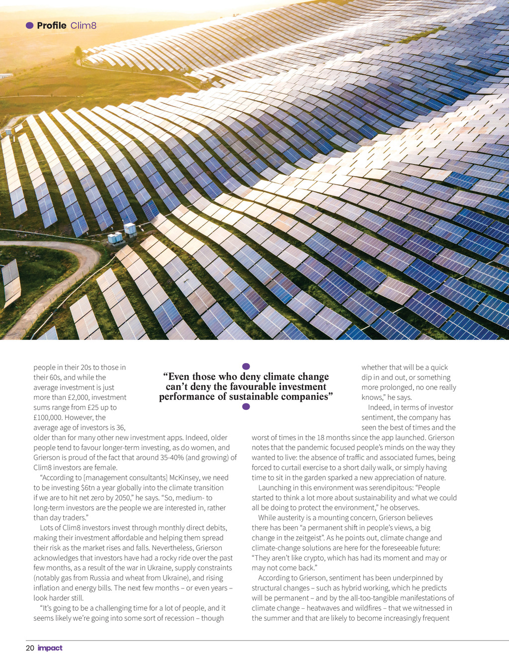 Profile Clim8 whether that will be a quick people in their 20s to those in dip in and out, or something their 60s, and while the Even those who deny climate change more prolonged, no one really average investment is just cant deny the favourable investment knows, he says. more than 2,000, investment performance of sustainable companies Indeed, in terms of investor sums range from 25 up to sentiment, the company has 100,000. However, the seen the best of times and the average age of investors is 36, worst of times in the 18 months since the app launched. Grierson older than for many other new investment apps. Indeed, older notes that the pandemic focused peoples minds on the way they people tend to favour longer-term investing, as do women, and wanted to live: the absence of traffic and associated fumes, being Grierson is proud of the fact that around 35-40% (and growing) of forced to curtail exercise to a short daily walk, or simply having Clim8 investors are female. time to sit in the garden sparked a new appreciation of nature. According to [management consultants] McKinsey, we need Launching in this environment was serendipitous: People to be investing $6tn a year globally into the climate transition started to think a lot more about sustainability and what we could if we are to hit net zero by 2050, he says. So, medium- to all be doing to protect the environment, he observes. long-term investors are the people we are interested in, rather While austerity is a mounting concern, Grierson believes than day traders. there has been a permanent shift in peoples views, a big Lots of Clim8 investors invest through monthly direct debits, change in the zeitgeist. As he points out, climate change and making their investment affordable and helping them spread climate-change solutions are here for the foreseeable future: their risk as the market rises and falls. Nevertheless, Grierson They arent like crypto, which has had its moment and may or acknowledges that investors have had a rocky ride over the past may not come back. few months, as a result of the war in Ukraine, supply constraints According to Grierson, sentiment has been underpinned by (notably gas from Russia and wheat from Ukraine), and rising structural changes such as hybrid working, which he predicts inflation and energy bills. The next few months or even years will be permanent and by the all-too-tangible manifestations of look harder still. climate change heatwaves and wildfires that we witnessed in Its going to be a challenging time for a lot of people, and it the summer and that are likely to become increasingly frequent seems likely were going into some sort of recession though 20 Impact ISSUE 39 2022_pp18-21_Profile.indd 20 23/09/2022 14:58