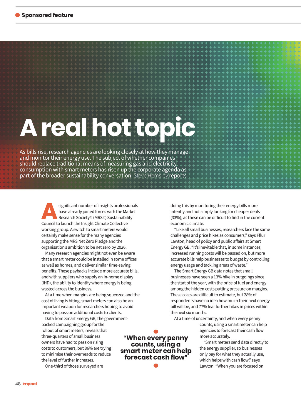 Sponsored feature A real hot topic As bills rise, research agencies are looking closely at how they manage and monitor their energy use. The subject of whether companies should replace traditional means of measuring gas and electricity consumption with smart meters has risen up the corporate agenda as part of the broader sustainability conversation. Steve Hemsley reports A doing this by monitoring their energy bills more significant number of insights professionals intently and not simply looking for cheaper deals have already joined forces with the Market (33%), as these can be difficult to find in the current Research Societys (MRSs) Sustainability economic climate. Council to launch the Insight Climate Collective Like all small businesses, researchers face the same working group. A switch to smart meters would challenges and price hikes as consumers, says Fflur certainly make sense for the many agencies Lawton, head of policy and public affairs at Smart supporting the MRS Net Zero Pledge and the Energy GB. Its inevitable that, in some instances, organisations ambition to be net zero by 2026. increased running costs will be passed on, but more Many research agencies might not even be aware accurate bills help businesses to budget by controlling that a smart meter could be installed in some offices energy usage and tackling areas of waste. as well as homes, and deliver similar time-saving The Smart Energy GB data notes that small benefits. These paybacks include more accurate bills, businesses have seen a 13% hike in outgoings since and with suppliers who supply an in-home display the start of the year, with the price of fuel and energy (IHD), the ability to identify where energy is being among the hidden costs putting pressure on margins. wasted across the business. These costs are difficult to estimate, but 28% of At a time when margins are being squeezed and the respondents have no idea how much their next energy cost of living is biting, smart meters can also be an bill will be, and 77% fear further hikes in prices within important weapon for researchers hoping to avoid the next six months. having to pass on additional costs to clients. At a time of uncertainty, and when every penny Data from Smart Energy GB, the governmentcounts, using a smart meter can help backed campaigning group for the agencies to forecast their cash flow rollout of smart meters, reveals that more accurately. three-quarters of small business When every penny Smart meters send data directly to owners have had to pass on rising counts, using a the energy supplier, so businesses costs to customers, but 86% are trying smart meter can help only pay for what they actually use, to minimise their overheads to reduce forecast cash ow which helps with cash flow, says the level of further increases. Lawton. When you are focused on One-third of those surveyed are 48 Impact ISSUE 39 2022_pp48-49_Smart Energy.indd 48 26/09/2022 10:52