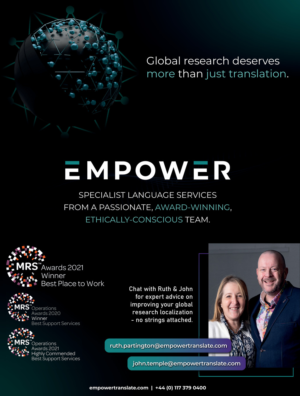 Global research deserves more than just translation. SPECIALIST LANGUAGE SERVICES FROM A PASSIONATE, AWARD-WINNING, ETHICALLY-CONSCIOUS TEAM. Chat with Ruth & John for expert advice on improving your global research localization - no strings attached. ruth.partington@empowertranslate.com john.temple@empowertranslate.com empowertranslate.com | +44 (0) 117 379 0400 Impact ISSUE 39 2022_pp8-9_WV intro.indd 8 23/09/2022 12:42