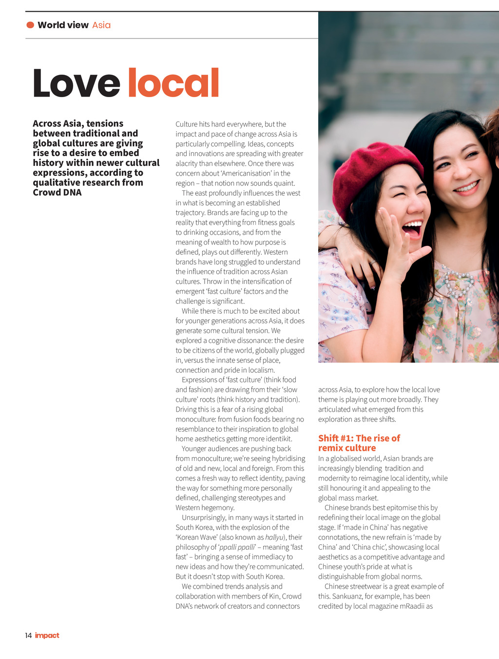 World view Asia Love local Across Asia, tensions between traditional and global cultures are giving rise to a desire to embed history within newer cultural expressions, according to qualitative research from Crowd DNA Culture hits hard everywhere, but the impact and pace of change across Asia is particularly compelling. Ideas, concepts and innovations are spreading with greater alacrity than elsewhere. Once there was concern about Americanisation in the region that notion now sounds quaint. The east profoundly influences the west in what is becoming an established trajectory. Brands are facing up to the reality that everything from fitness goals to drinking occasions, and from the meaning of wealth to how purpose is defined, plays out differently. Western brands have long struggled to understand the influence of tradition across Asian cultures. Throw in the intensification of emergent fast culture factors and the challenge is significant. While there is much to be excited about for younger generations across Asia, it does generate some cultural tension. We explored a cognitive dissonance: the desire to be citizens of the world, globally plugged in, versus the innate sense of place, connection and pride in localism. Expressions of fast culture (think food and fashion) are drawing from their slow culture roots (think history and tradition). Driving this is a fear of a rising global monoculture: from fusion foods bearing no resemblance to their inspiration to global home aesthetics getting more identikit. Younger audiences are pushing back from monoculture; were seeing hybridising of old and new, local and foreign. From this comes a fresh way to reflect identity, paving the way for something more personally defined, challenging stereotypes and Western hegemony. Unsurprisingly, in many ways it started in South Korea, with the explosion of the Korean Wave (also known as hallyu), their philosophy of ppalli ppalli meaning fast fast bringing a sense of immediacy to new ideas and how theyre communicated. But it doesnt stop with South Korea. We combined trends analysis and collaboration with members of Kin, Crowd DNAs network of creators and connectors across Asia, to explore how the local love theme is playing out more broadly. They articulated what emerged from this exploration as three shifts. Shift #1: The rise of remix culture In a globalised world, Asian brands are increasingly blending tradition and modernity to reimagine local identity, while still honouring it and appealing to the global mass market. Chinese brands best epitomise this by redefining their local image on the global stage. If made in China has negative connotations, the new refrain is made by China and China chic, showcasing local aesthetics as a competitive advantage and Chinese youths pride at what is distinguishable from global norms. Chinese streetwear is a great example of this. Sankuanz, for example, has been credited by local magazine mRaadii as 14 Impact ISSUE 40 2022_pp14-15 WV Asia.indd 14 13/12/2022 11:21