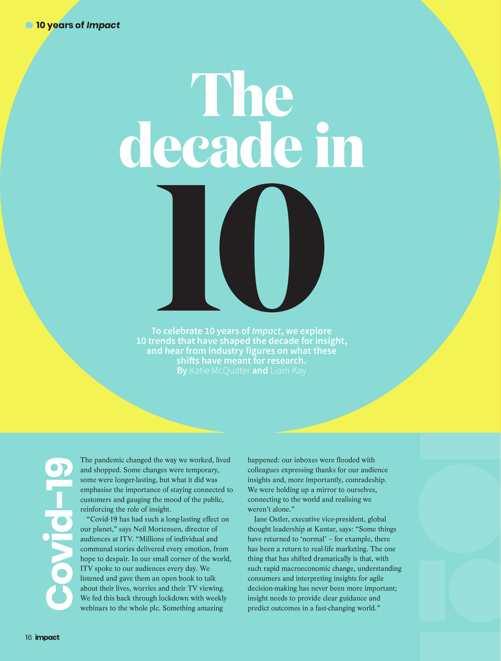 10 years of Impact The decade in 10 To celebrate 10 years of Impact, we explore 10 trends that have shaped the decade for insight, and hear from industry gures on what these shifts have meant for research. By Katie McQuater and Liam Kay Covid-19 The pandemic changed the way we worked, lived and shopped. Some changes were temporary, some were longer-lasting, but what it did was emphasise the importance of staying connected to customers and gauging the mood of the public, reinforcing the role of insight. Covid-19 has had such a long-lasting eect on our planet, says Neil Mortensen, director of audiences at ITV. Millions of individual and communal stories delivered every emotion, from hope to despair. In our small corner of the world, ITV spoke to our audiences every day. We listened and gave them an open book to talk about their lives, worries and their TV viewing. We fed this back through lockdown with weekly webinars to the whole plc. Something amazing happened: our inboxes were flooded with colleagues expressing thanks for our audience insights and, more importantly, comradeship. We were holding up a mirror to ourselves, connecting to the world and realising we werent alone. Jane Ostler, executive vice-president, global thought leadership at Kantar, says: Some things have returned to normal for example, there has been a return to real-life marketing. The one thing that has shifted dramatically is that, with such rapid macroeconomic change, understanding consumers and interpreting insights for agile decision-making has never been more important; insight needs to provide clear guidance and predict outcomes in a fast-changing world. 16 Impact ISSUE 40 2022_pp16-21_10 years of Impact.indd 16 13/12/2022 11:26