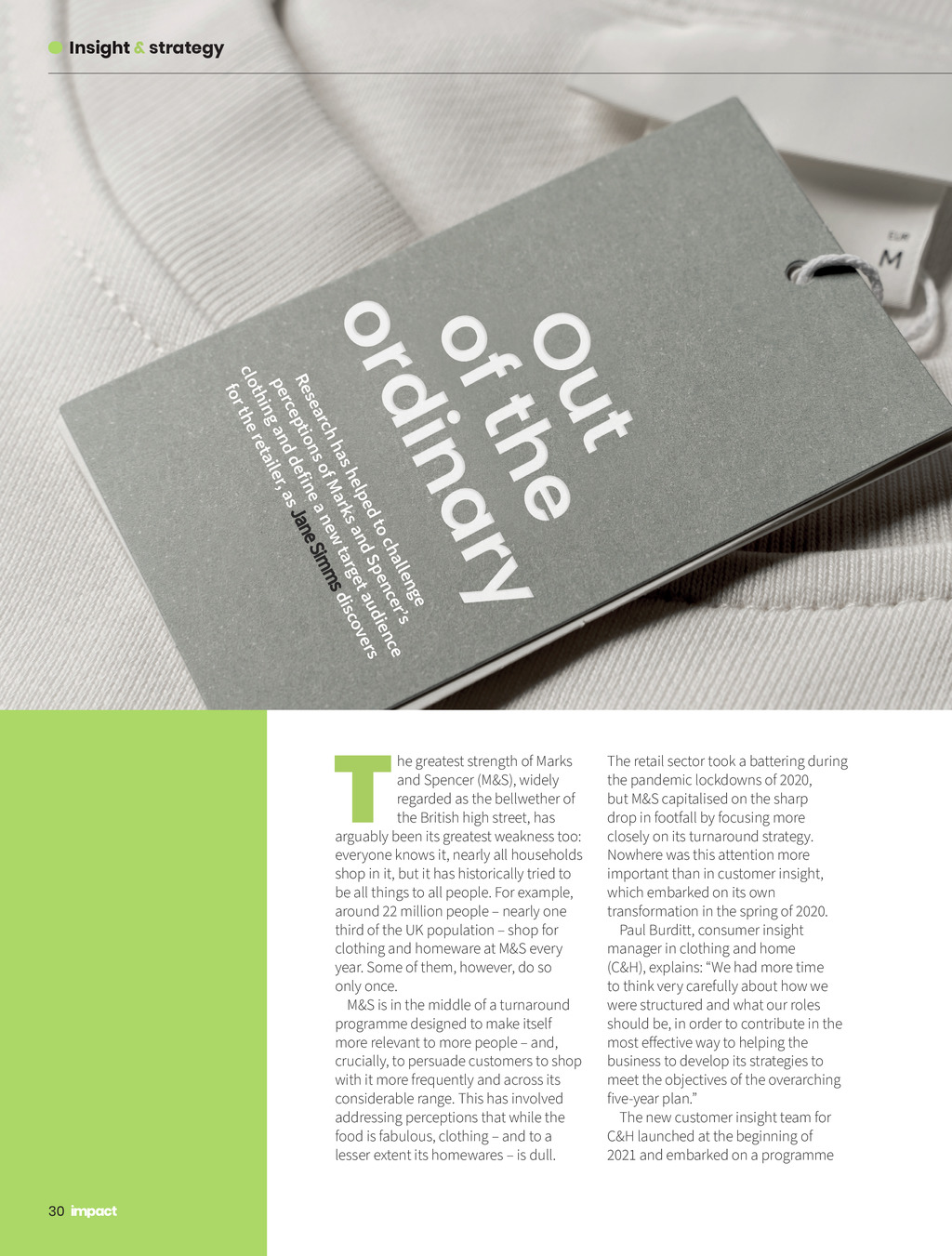 Insight & strategy ge len s e c hal cer to c Spen udien rs ped nd t a ve hel ks a rge isco has ar w ta s d rch of M a ne Simm e ns sea Re eptio den s Jane c a d per g an iler, n eta r thi clo r the fo T he greatest strength of Marks and Spencer (M&S), widely regarded as the bellwether of the British high street, has arguably been its greatest weakness too: everyone knows it, nearly all households shop in it, but it has historically tried to be all things to all people. For example, around 22 million people nearly one third of the UK population shop for clothing and homeware at M&S every year. Some of them, however, do so only once. M&S is in the middle of a turnaround programme designed to make itself more relevant to more people and, crucially, to persuade customers to shop with it more frequently and across its considerable range. This has involved addressing perceptions that while the food is fabulous, clothing and to a lesser extent its homewares is dull. The retail sector took a battering during the pandemic lockdowns of 2020, but M&S capitalised on the sharp drop in footfall by focusing more closely on its turnaround strategy. Nowhere was this attention more important than in customer insight, which embarked on its own transformation in the spring of 2020. Paul Burditt, consumer insight manager in clothing and home (C&H), explains: We had more time to think very carefully about how we were structured and what our roles should be, in order to contribute in the most effective way to helping the business to develop its strategies to meet the objectives of the overarching five-year plan. The new customer insight team for C&H launched at the beginning of 2021 and embarked on a programme 30 Impact ISSUE 40 2022_pp30-33 I&S M&S.indd 30 13/12/2022 11:38