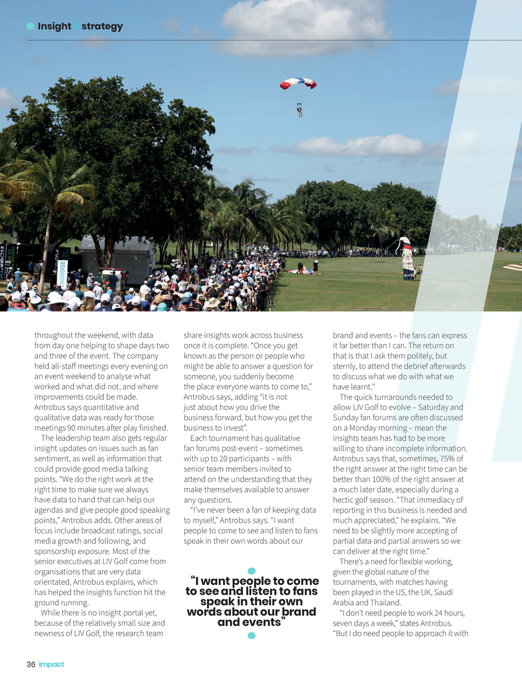 Insight & strategy throughout the weekend, with data from day one helping to shape days two and three of the event. The company held all-staff meetings every evening on an event weekend to analyse what worked and what did not, and where improvements could be made. Antrobus says quantitative and qualitative data was ready for those meetings 90 minutes after play finished. The leadership team also gets regular insight updates on issues such as fan sentiment, as well as information that could provide good media talking points. We do the right work at the right time to make sure we always have data to hand that can help our agendas and give people good speaking points, Antrobus adds. Other areas of focus include broadcast ratings, social media growth and following, and sponsorship exposure. Most of the senior executives at LIV Golf come from organisations that are very data orientated, Antrobus explains, which has helped the insights function hit the ground running. While there is no insight portal yet, because of the relatively small size and newness of LIV Golf, the research team share insights work across business once it is complete. Once you get known as the person or people who might be able to answer a question for someone, you suddenly become the place everyone wants to come to, Antrobus says, adding it is not just about how you drive the business forward, but how you get the business to invest. Each tournament has qualitative fan forums post-event sometimes with up to 20 participants with senior team members invited to attend on the understanding that they make themselves available to answer any questions. Ive never been a fan of keeping data to myself, Antrobus says. I want people to come to see and listen to fans speak in their own words about our I want people to come to see and listen to fans speak in their own words about our brand and events brand and events the fans can express it far better than I can. The return on that is that I ask them politely, but sternly, to attend the debrief afterwards to discuss what we do with what we have learnt. The quick turnarounds needed to allow LIV Golf to evolve Saturday and Sunday fan forums are often discussed on a Monday morning mean the insights team has had to be more willing to share incomplete information. Antrobus says that, sometimes, 75% of the right answer at the right time can be better than 100% of the right answer at a much later date, especially during a hectic golf season. That immediacy of reporting in this business is needed and much appreciated, he explains. We need to be slightly more accepting of partial data and partial answers so we can deliver at the right time. Theres a need for flexible working, given the global nature of the tournaments, with matches having been played in the US, the UK, Saudi Arabia and Thailand. I dont need people to work 24 hours, seven days a week, states Antrobus. But I do need people to approach it with 36 Impact ISSUE 40 2022_pp34-37 I&S LIV Golf.indd 36 13/12/2022 17:12