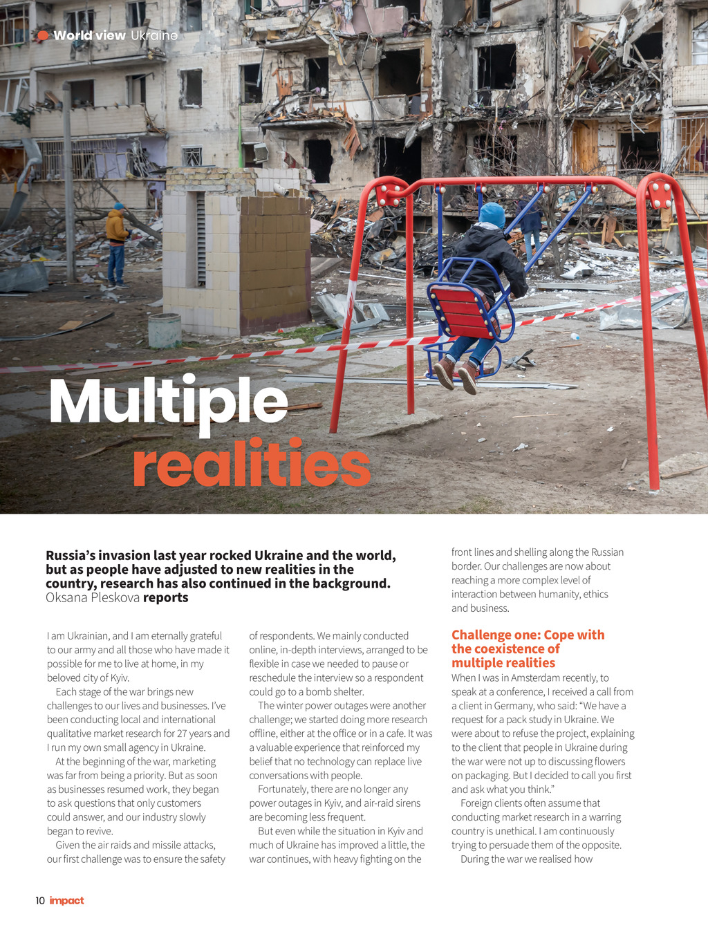 World view Ukraine Multiple realities Russias invasion last year rocked Ukraine and the world, but as people have adjusted to new realities in the country, research has also continued in the background. Oksana Pleskova reports I am Ukrainian, and I am eternally grateful to our army and all those who have made it possible for me to live at home, in my beloved city of Kyiv. Each stage of the war brings new challenges to our lives and businesses. Ive been conducting local and international qualitative market research for 27 years and I run my own small agency in Ukraine. At the beginning of the war, marketing was far from being a priority. But as soon as businesses resumed work, they began to ask questions that only customers could answer, and our industry slowly began to revive. Given the air raids and missile attacks, our first challenge was to ensure the safety of respondents. We mainly conducted online, in-depth interviews, arranged to be flexible in case we needed to pause or reschedule the interview so a respondent could go to a bomb shelter. The winter power outages were another challenge; we started doing more research offline, either at the office or in a cafe. It was a valuable experience that reinforced my belief that no technology can replace live conversations with people. Fortunately, there are no longer any power outages in Kyiv, and air-raid sirens are becoming less frequent. But even while the situation in Kyiv and much of Ukraine has improved a little, the war continues, with heavy fighting on the front lines and shelling along the Russian border. Our challenges are now about reaching a more complex level of interaction between humanity, ethics and business. Challenge one: Cope with the coexistence of multiple realities When I was in Amsterdam recently, to speak at a conference, I received a call from a client in Germany, who said: We have a request for a pack study in Ukraine. We were about to refuse the project, explaining to the client that people in Ukraine during the war were not up to discussing flowers on packaging. But I decided to call you first and ask what you think. Foreign clients often assume that conducting market research in a warring country is unethical. I am continuously trying to persuade them of the opposite. During the war we realised how 10 Impact ISSUE 42 2023_pp10-11 WV Ukraine.indd 10 16/06/2023 16:54