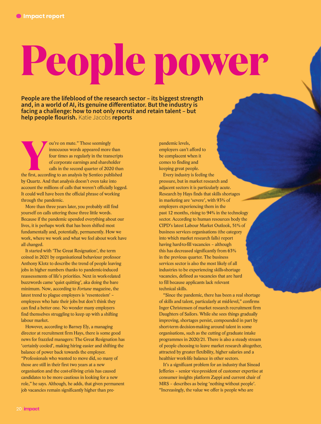 Impact report People power People are the lifeblood of the research sector its biggest strength and, in a world of AI, its genuine differentiator. But the industry is facing a challenge: how to not only recruit and retain talent but help people flourish. Katie Jacobs reports Y oure on mute. These seemingly innocuous words appeared more than four times as regularly in the transcripts of corporate earnings and shareholder calls in the second quarter of 2020 than the first, according to an analysis by Sentieo published by Quartz. And that analysis doesnt even take into account the millions of calls that werent ocially logged. It could well have been the ocial phrase of working through the pandemic. More than three years later, you probably still find yourself on calls uttering those three little words. Because if the pandemic upended everything about our lives, it is perhaps work that has been shifted most fundamentally and, potentially, permanently. How we work, where we work and what we feel about work have all changed. It started with The Great Resignation, the term coined in 2021 by organisational behaviour professor Anthony Klotz to describe the trend of people leaving jobs in higher numbers thanks to pandemic-induced reassessments of lifes priorities. Next in work-related buzzwords came quiet quitting, aka doing the bare minimum. Now, according to Fortune magazine, the latest trend to plague employers is resenteeism employees who hate their jobs but dont think they can find a better one. No wonder many employers find themselves struggling to keep up with a shifting labour market. However, according to Barney Ely, a managing director at recruitment firm Hays, there is some good news for frazzled managers: The Great Resignation has certainly cooled, making hiring easier and shifting the balance of power back towards the employer. Professionals who wanted to move did, so many of those are still in their first two years at a new organisation and the cost-of-living crisis has caused candidates to be more cautious in looking for a new role, he says. Although, he adds, that given permanent job vacancies remain significantly higher than pre- pandemic levels, employers cant aord to be complacent when it comes to finding and keeping great people. Every industry is feeling the pressure, but in market research and adjacent sectors it is particularly acute. Research by Hays finds that skills shortages in marketing are severe, with 93% of employers experiencing them in the past 12 months, rising to 94% in the technology sector. According to human resources body the CIPDs latest Labour Market Outlook, 51% of business services organisations (the category into which market research falls) report having hard-to-fill vacancies although this has decreased significantly from 63% in the previous quarter. The business services sector is also the most likely of all industries to be experiencing skills-shortage vacancies, defined as vacancies that are hard to fill because applicants lack relevant technical skills. Since the pandemic, there has been a real shortage of skills and talent, particularly at mid-level, confirms Inger Christensen of market research recruitment firm Daughters of Sailors. While she sees things gradually improving, shortages persist, compounded in part by short-term decision-making around talent in some organisations, such as the cutting of graduate intake programmes in 2020/21. There is also a steady stream of people choosing to leave market research altogether, attracted by greater flexibility, higher salaries and a healthier work-life balance in other sectors. Its a significant problem for an industry that Sinead Jeeries senior vice-president of customer expertise at consumer insights platform Zappi and current chair of MRS describes as being nothing without people. Increasingly, the value we oer is people who are 20 Impact ISSUE 42 2023_pp20-27_Report.indd 20 16/06/2023 17:03