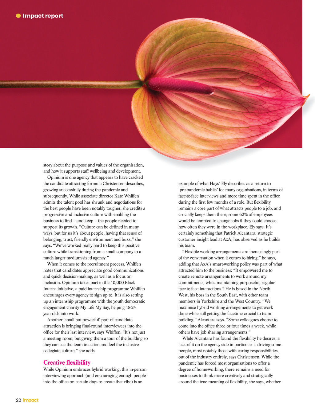 Impact report story about the purpose and values of the organisation, and how it supports sta wellbeing and development. Opinium is one agency that appears to have cracked the candidate-attracting formula Christensen describes, growing successfully during the pandemic and subsequently. While associate director Kate Whien admits the talent pool has shrunk and negotiations for the best people have been notably tougher, she credits a progressive and inclusive culture with enabling the business to find and keep the people needed to support its growth. Culture can be defined in many ways, but for us its about people, having that sense of belonging, trust, friendly environment and buzz, she says. Weve worked really hard to keep this positive culture while transitioning from a small company to a much larger medium-sized agency. When it comes to the recruitment process, Whien notes that candidates appreciate good communications and quick decision-making, as well as a focus on inclusion. Opinium takes part in the 10,000 Black Interns initiative, a paid internship programme Whien encourages every agency to sign up to. It is also setting up an internship programme with the youth democratic engagement charity My Life My Say, helping 18-24 year-olds into work. Another small but powerful part of candidate attraction is bringing final-round interviewees into the oce for their last interview, says Whien. Its not just a meeting room, but giving them a tour of the building so they can see the team in action and feel the inclusive collegiate culture, she adds. Creative flexibility While Opinium embraces hybrid working, this in-person interviewing approach (and encouraging enough people into the oce on certain days to create that vibe) is an example of what Hays Ely describes as a return to pre-pandemic habits for many organisations, in terms of face-to-face interviews and more time spent in the oce during the first few months of a role. But flexibility remains a core part of what attracts people to a job, and crucially keeps them there; some 62% of employees would be tempted to change jobs if they could choose how often they were in the workplace, Ely says. Its certainly something that Patrick Alcantara, strategic customer insight lead at AxA, has observed as he builds his team. Flexible working arrangements are increasingly part of the conversation when it comes to hiring, he says, adding that AxAs smart-working policy was part of what attracted him to the business: It empowered me to create remote arrangements to work around my commitments, while maintaining purposeful, regular face-to-face interactions. He is based in the North West, his boss in the South East, with other team members in Yorkshire and the West Country. We maximise hybrid working arrangements to get work done while still getting the facetime crucial to team building, Alcantara says. Some colleagues choose to come into the oce three or four times a week, while others have job sharing arrangements. While Alcantara has found the flexibility he desires, a lack of it on the agency side in particular is driving some people, most notably those with caring responsibilities, out of the industry entirely, says Christensen. While the pandemic has forced most organisations to oer a degree of home-working, there remains a need for businesses to think more creatively and strategically around the true meaning of flexibility, she says, whether 22 Impact ISSUE 42 2023_pp20-27_Report.indd 22 16/06/2023 17:04