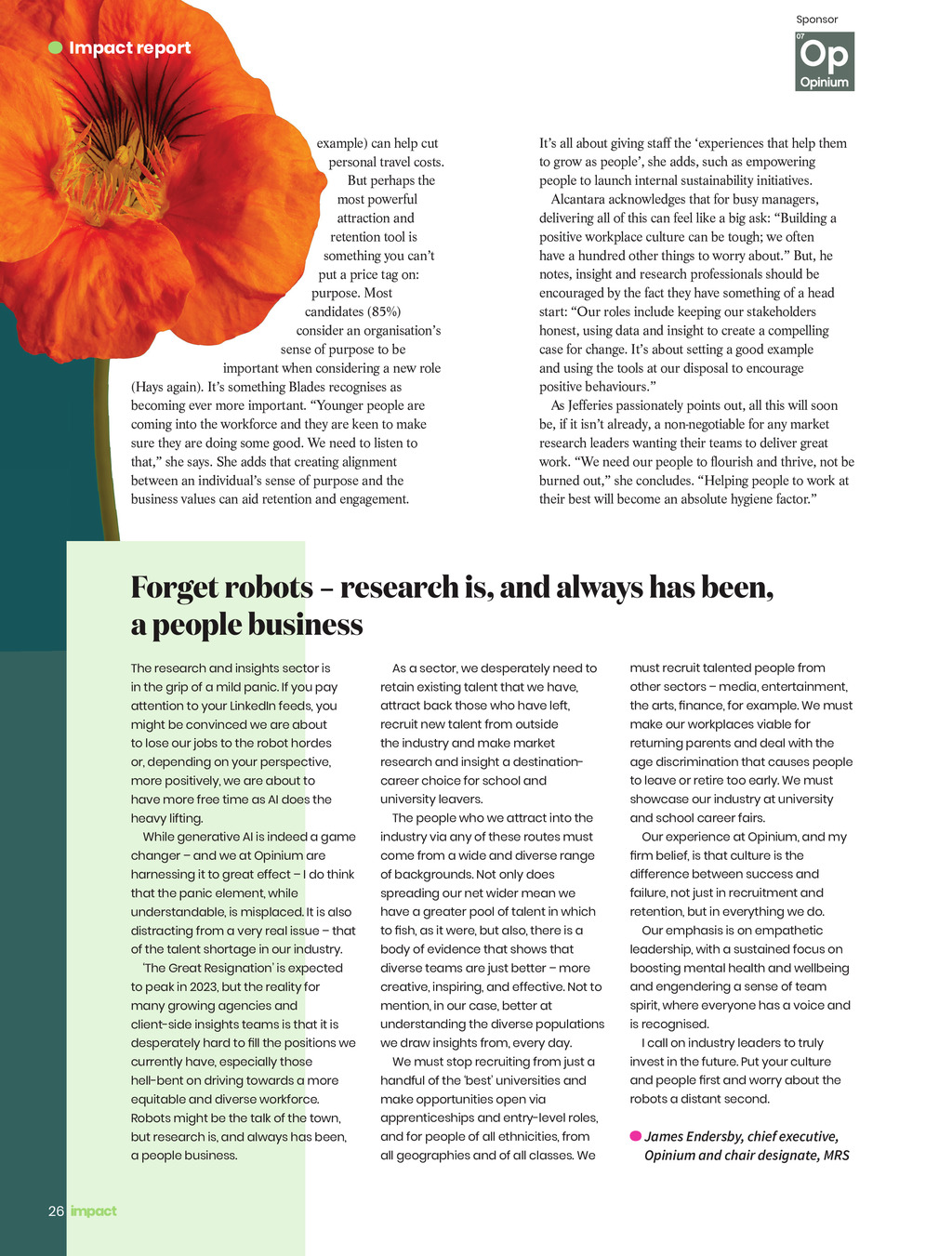 Sponsor Impact report example) can help cut personal travel costs. But perhaps the most powerful attraction and retention tool is something you cant put a price tag on: purpose. Most candidates (85%) consider an organisations sense of purpose to be important when considering a new role (Hays again). Its something Blades recognises as becoming ever more important. Younger people are coming into the workforce and they are keen to make sure they are doing some good. We need to listen to that, she says. She adds that creating alignment between an individuals sense of purpose and the business values can aid retention and engagement. Its all about giving sta the experiences that help them to grow as people, she adds, such as empowering people to launch internal sustainability initiatives. Alcantara acknowledges that for busy managers, delivering all of this can feel like a big ask: Building a positive workplace culture can be tough; we often have a hundred other things to worry about. But, he notes, insight and research professionals should be encouraged by the fact they have something of a head start: Our roles include keeping our stakeholders honest, using data and insight to create a compelling case for change. Its about setting a good example and using the tools at our disposal to encourage positive behaviours. As Jeeries passionately points out, all this will soon be, if it isnt already, a non-negotiable for any market research leaders wanting their teams to deliver great work. We need our people to flourish and thrive, not be burned out, she concludes. Helping people to work at their best will become an absolute hygiene factor. Forget robots research is, and always has been, a people business The research and insights sector is As a sector, we desperately need to must recruit talented people from in the grip of a mild panic. If you pay retain existing talent that we have, other sectors media, entertainment, attention to your LinkedIn feeds, you attract back those who have left, the arts, nance, for example. We must might be convinced we are about recruit new talent from outside make our workplaces viable for to lose our jobs to the robot hordes the industry and make market returning parents and deal with the or, depending on your perspective, research and insight a destination- age discrimination that causes people more positively, we are about to career choice for school and to leave or retire too early. We must have more free time as AI does the university leavers. showcase our industry at university heavy lifting. While generative AI is indeed a game The people who we attract into the industry via any of these routes must and school career fairs. Our experience at Opinium, and my changer and we at Opinium are come from a wide and diverse range rm belief, is that culture is the harnessing it to great effect I do think of backgrounds. Not only does difference between success and that the panic element, while spreading our net wider mean we failure, not just in recruitment and understandable, is misplaced. It is also have a greater pool of talent in which retention, but in everything we do. distracting from a very real issue that to sh, as it were, but also, there is a of the talent shortage in our industry. body of evidence that shows that leadership, with a sustained focus on Our emphasis is on empathetic diverse teams are just better more boosting mental health and wellbeing to peak in 2023, but the reality for creative, inspiring, and effective. Not to and engendering a sense of team many growing agencies and mention, in our case, better at spirit, where everyone has a voice and client-side insights teams is that it is understanding the diverse populations is recognised. desperately hard to ll the positions we we draw insights from, every day. The Great Resignation is expected currently have, especially those We must stop recruiting from just a I call on industry leaders to truly invest in the future. Put your culture hell-bent on driving towards a more handful of the best universities and and people rst and worry about the equitable and diverse workforce. make opportunities open via robots a distant second. Robots might be the talk of the town, apprenticeships and entry-level roles, but research is, and always has been, and for people of all ethnicities, from a people business. all geographies and of all classes. We James Endersby, chief executive, Opinium and chair designate, MRS 26 Impact ISSUE 42 2023_pp20-27_Report.indd 26 16/06/2023 17:04