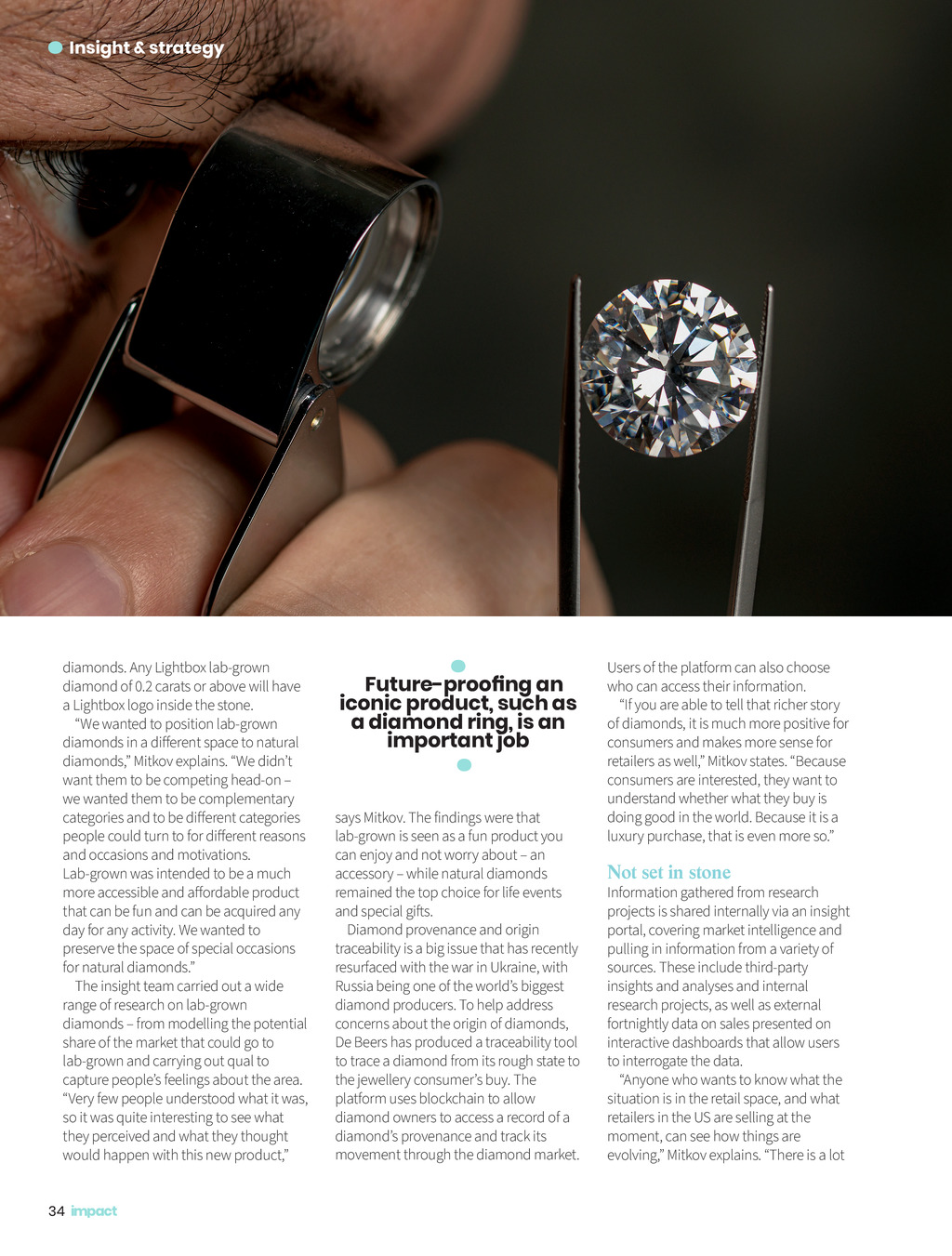 Insight & strategy diamonds. Any Lightbox lab-grown diamond of 0.2 carats or above will have a Lightbox logo inside the stone. We wanted to position lab-grown diamonds in a different space to natural diamonds, Mitkov explains. We didnt want them to be competing head-on we wanted them to be complementary categories and to be different categories people could turn to for different reasons and occasions and motivations. Lab-grown was intended to be a much more accessible and affordable product that can be fun and can be acquired any day for any activity. We wanted to preserve the space of special occasions for natural diamonds. The insight team carried out a wide range of research on lab-grown diamonds from modelling the potential share of the market that could go to lab-grown and carrying out qual to capture peoples feelings about the area. Very few people understood what it was, so it was quite interesting to see what they perceived and what they thought would happen with this new product, Future-proofing an iconic product, such as a diamond ring, is an important job says Mitkov. The findings were that lab-grown is seen as a fun product you can enjoy and not worry about an accessory while natural diamonds remained the top choice for life events and special gifts. Diamond provenance and origin traceability is a big issue that has recently resurfaced with the war in Ukraine, with Russia being one of the worlds biggest diamond producers. To help address concerns about the origin of diamonds, De Beers has produced a traceability tool to trace a diamond from its rough state to the jewellery consumers buy. The platform uses blockchain to allow diamond owners to access a record of a diamonds provenance and track its movement through the diamond market. Users of the platform can also choose who can access their information. If you are able to tell that richer story of diamonds, it is much more positive for consumers and makes more sense for retailers as well, Mitkov states. Because consumers are interested, they want to understand whether what they buy is doing good in the world. Because it is a luxury purchase, that is even more so. Not set in stone Information gathered from research projects is shared internally via an insight portal, covering market intelligence and pulling in information from a variety of sources. These include third-party insights and analyses and internal research projects, as well as external fortnightly data on sales presented on interactive dashboards that allow users to interrogate the data. Anyone who wants to know what the situation is in the retail space, and what retailers in the US are selling at the moment, can see how things are evolving, Mitkov explains. There is a lot 34 Impact ISSUE 42 2023_pp32-35 I&S De Beers.indd 34 16/06/2023 17:12