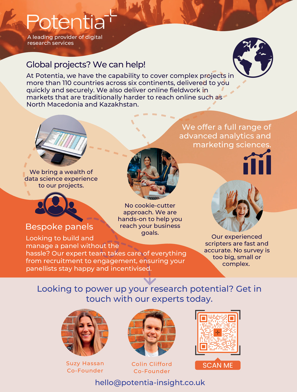 A leading provider of digital research services Global projects? We can help! At Potentia, we have the capability to cover complex projects ro ts in more than 110 countries across six continents, delivered ed to you o quickly and securely. We also deliver online fieldwork iin n markets that are traditionally harder to reach online such as ch a s North Macedonia and Kazakhstan. We offer a full range of advanced analytics and marketing sciences. We bring a wealth of d data science experience to our projects. No cookie-cutter approach. We are hands-on to help you reach your business goals. Bespoke panels Looking to build and manage a panel without the hassle? Our expert team takes care of everything from recruitment to engagement, ensuring your panellists stay happy and incentivised. Our experienced scripters are fast and accurate. No survey is too big, small or complex. Looking to power up your research potential? Get in touch with our experts today. Suzy Hassan Co-Founder Colin Clifford Co-Founder hello@potentia-insight.co.uk Impact ISSUE 42 2023_pp36-37_Lorna_Tilbian.indd 36 16/06/2023 17:13