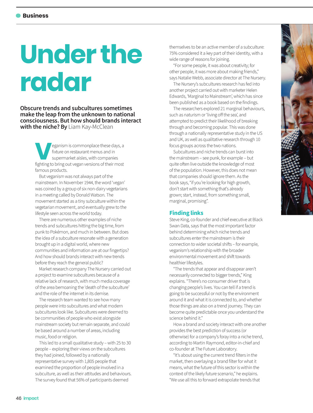 Business Under the radar Obscure trends and subcultures sometimes make the leap from the unknown to national consciousness. But how should brands interact with the niche? By Liam Kay-McClean V eganism is commonplace these days, a fixture on restaurant menus and in supermarket aisles, with companies fighting to bring out vegan versions of their most famous products. But veganism was not always part of the mainstream. In November 1944, the word vegan was coined by a group of six non-dairy vegetarians in a meeting called by Donald Watson. The movement started as a tiny subculture within the vegetarian movement, and eventually grew to the lifestyle seen across the world today. There are numerous other examples of niche trends and subcultures hitting the big time, from punk to Pokmon, and much in between. But does the idea of a subculture resonate with a generation brought up in a digital world, where new communities and information are at our fingertips? And how should brands interact with new trends before they reach the general public? Market research company The Nursery carried out a project to examine subcultures because of a relative lack of research, with much media coverage of the area bemoaning the death of the subculture and the role of the internet in its demise. The research team wanted to see how many people were into subcultures and what modern subcultures look like. Subcultures were deemed to be communities of people who exist alongside mainstream society but remain separate, and could be based around a number of areas, including music, food or religion. This led to a small qualitative study with 25 to 30 people exploring their views on the subcultures they had joined, followed by a nationally representative survey with 1,805 people that examined the proportion of people involved in a subculture, as well as their attitudes and behaviours. The survey found that 56% of participants deemed themselves to be an active member of a subculture: 75% considered it a key part of their identity, with a wide range of reasons for joining. For some people, it was about creativity; for other people, it was more about making friends, says Natalie Webb, associate director at The Nursery. The Nurserys subcultures research has fed into another project carried out with marketer Helen Edwards, Marginal to Mainstream, which has since been published as a book based on the findings. The researchers explored 21 marginal behaviours, such as naturism or living off the sea, and attempted to predict their likelihood of breaking through and becoming popular. This was done through a nationally representative study in the US and UK, as well as qualitative research through 10 focus groups across the two nations. Subcultures and niche trends can burst into the mainstream see punk, for example but quite often live outside the knowledge of most of the population. However, this does not mean that companies should ignore them. As the book says, if youre looking for high growth, dont start with something thats already grown; start, instead, from something small, marginal, promising. Finding links Steve King, co-founder and chief executive at Black Swan Data, says that the most important factor behind determining which niche trends and subcultures enter the mainstream is their connection to wider societal shifts for example, veganisms relationship with the broader environmental movement and shift towards healthier lifestyles. The trends that appear and disappear arent necessarily connected to bigger trends, King explains. Theres no consumer driver that is changing peoples lives. You can tell if a trend is going to be successful or not by the environment around it and what it is connected to, and whether those things are also on a trend journey. They can become quite predictable once you understand the science behind it. How a brand and society interact with one another provides the best prediction of success (or otherwise) for a companys foray into a niche trend, according to Martin Raymond, editor-in-chief and co-founder at The Future Laboratory. Its about using the current trend filters in the market, then overlaying a brand filter for what it means, what the future of this sector is within the context of the likely future scenario, he explains. We use all this to forward extrapolate trends that 46 Impact ISSUE 42 2023_pp46-47_Business.indd 46 16/06/2023 17:16