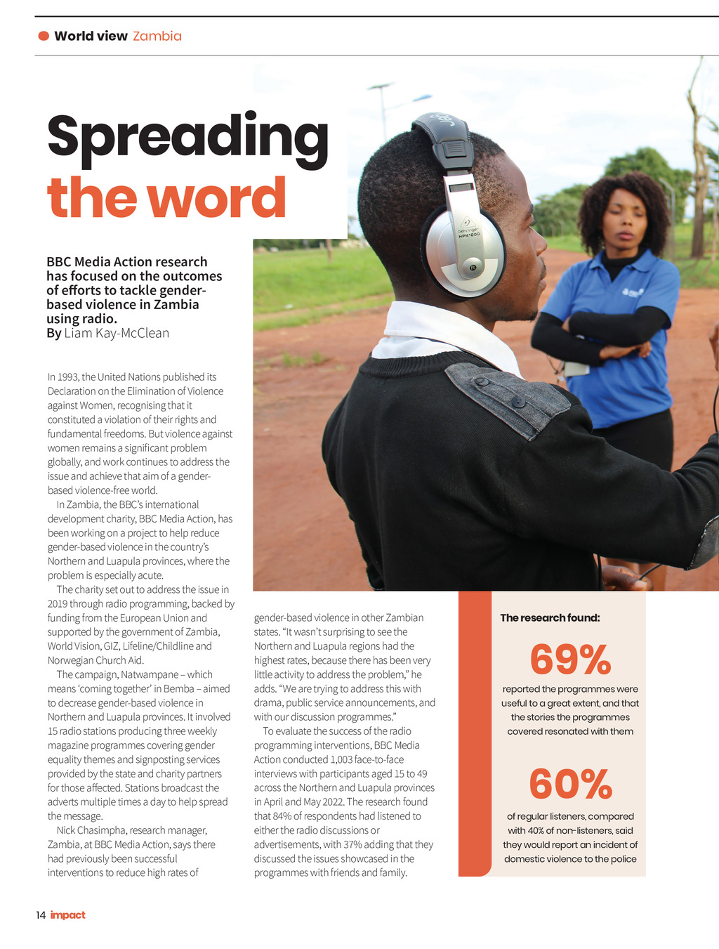World view Zambia Spreading the word BBC Media Action research has focused on the outcomes of efforts to tackle genderbased violence in Zambia using radio. By Liam Kay-McClean In 1993, the United Nations published its Declaration on the Elimination of Violence against Women, recognising that it constituted a violation of their rights and fundamental freedoms. But violence against women remains a significant problem globally, and work continues to address the issue and achieve that aim of a genderbased violence-free world. In Zambia, the BBCs international development charity, BBC Media Action, has been working on a project to help reduce gender-based violence in the countrys Northern and Luapula provinces, where the problem is especially acute. The charity set out to address the issue in 2019 through radio programming, backed by funding from the European Union and supported by the government of Zambia, World Vision, GIZ, Lifeline/Childline and Norwegian Church Aid. The campaign, Natwampane which means coming together in Bemba aimed to decrease gender-based violence in Northern and Luapula provinces. It involved 15 radio stations producing three weekly magazine programmes covering gender equality themes and signposting services provided by the state and charity partners for those affected. Stations broadcast the adverts multiple times a day to help spread the message. Nick Chasimpha, research manager, Zambia, at BBC Media Action, says there had previously been successful interventions to reduce high rates of gender-based violence in other Zambian states. It wasnt surprising to see the Northern and Luapula regions had the highest rates, because there has been very little activity to address the problem, he adds. We are trying to address this with drama, public service announcements, and with our discussion programmes. To evaluate the success of the radio programming interventions, BBC Media Action conducted 1,003 face-to-face interviews with participants aged 15 to 49 across the Northern and Luapula provinces in April and May 2022. The research found that 84% of respondents had listened to either the radio discussions or advertisements, with 37% adding that they discussed the issues showcased in the programmes with friends and family. The research found: 69% reported the programmes were useful to a great extent, and that the stories the programmes covered resonated with them 60% of regular listeners, compared with 40% of non-listeners, said they would report an incident of domestic violence to the police 14 Impact ISSUE 43 2023_pp14-15 WV Zambia.indd 14 18/09/2023 11:55