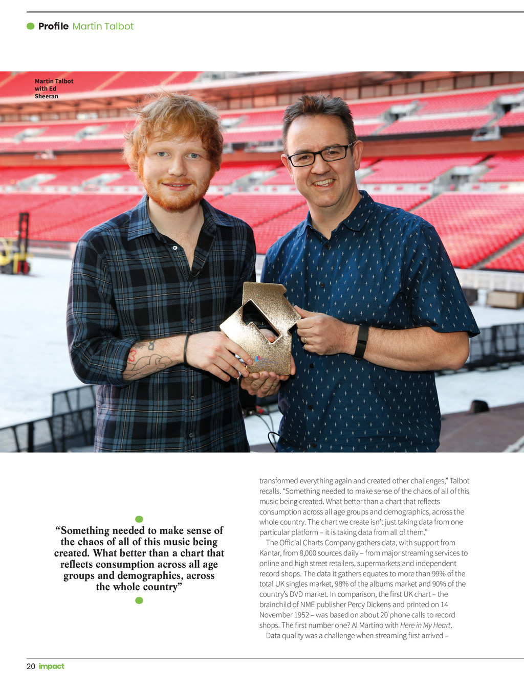 Profile Martin Talbot Martin Talbot with Ed Sheeran Something needed to make sense of the chaos of all of this music being created. What better than a chart that reflects consumption across all age groups and demographics, across the whole country transformed everything again and created other challenges, Talbot recalls. Something needed to make sense of the chaos of all of this music being created. What better than a chart that reflects consumption across all age groups and demographics, across the whole country. The chart we create isnt just taking data from one particular platform it is taking data from all of them. The Official Charts Company gathers data, with support from Kantar, from 8,000 sources daily from major streaming services to online and high street retailers, supermarkets and independent record shops. The data it gathers equates to more than 99% of the total UK singles market, 98% of the albums market and 90% of the countrys DVD market. In comparison, the first UK chart the brainchild of NME publisher Percy Dickens and printed on 14 November 1952 was based on about 20 phone calls to record shops. The first number one? Al Martino with Here in My Heart. Data quality was a challenge when streaming first arrived 20 Impact ISSUE 43 2023_pp18-21_Profile.indd 20 18/09/2023 12:02
