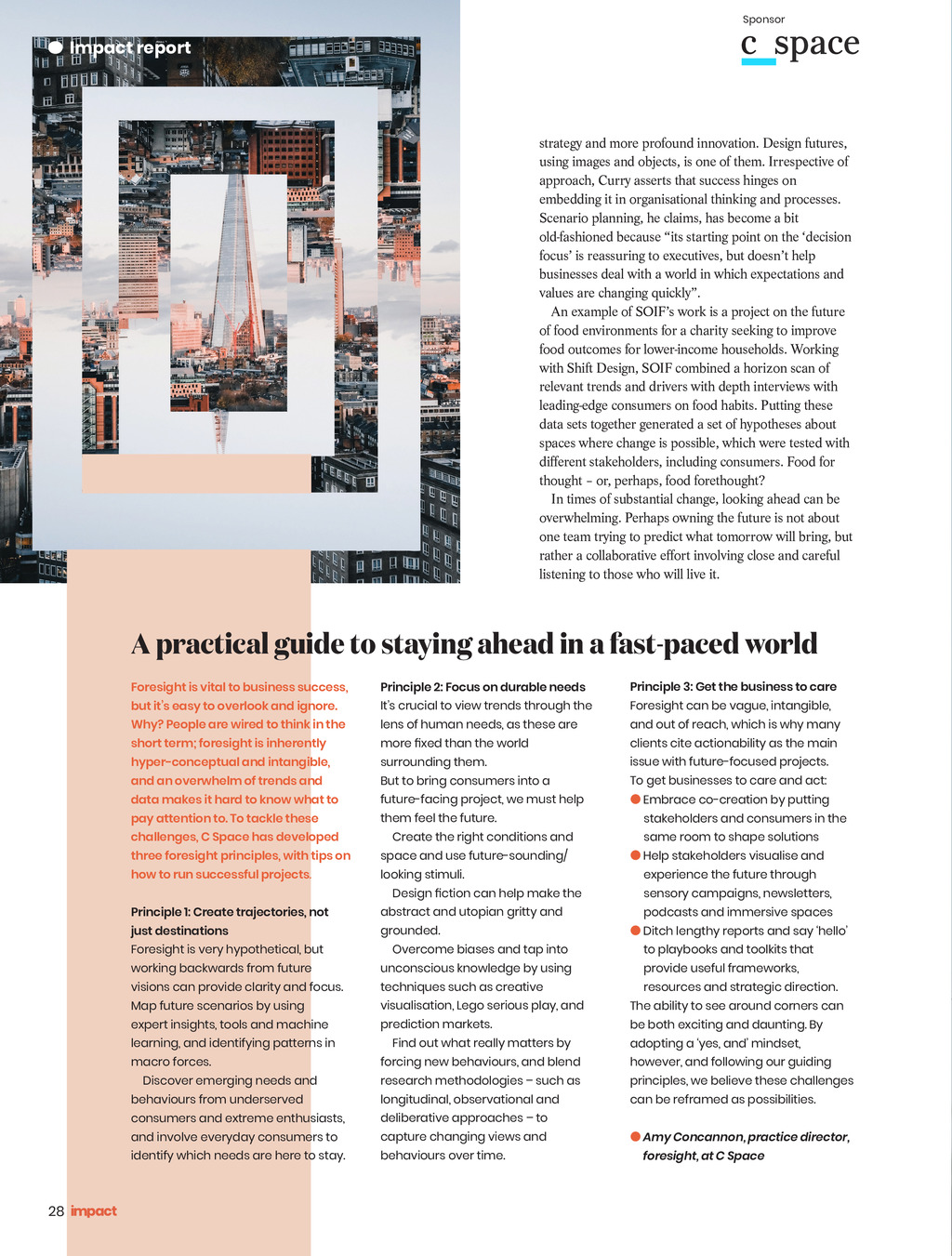 Sponsor Impact report strategy and more profound innovation. Design futures, using images and objects, is one of them. Irrespective of approach, Curry asserts that success hinges on embedding it in organisational thinking and processes. Scenario planning, he claims, has become a bit old-fashioned because its starting point on the decision focus is reassuring to executives, but doesnt help businesses deal with a world in which expectations and values are changing quickly. An example of SOIFs work is a project on the future of food environments for a charity seeking to improve food outcomes for lower-income households. Working with Shift Design, SOIF combined a horizon scan of relevant trends and drivers with depth interviews with leading-edge consumers on food habits. Putting these data sets together generated a set of hypotheses about spaces where change is possible, which were tested with dierent stakeholders, including consumers. Food for thought or, perhaps, food forethought? In times of substantial change, looking ahead can be overwhelming. Perhaps owning the future is not about one team trying to predict what tomorrow will bring, but rather a collaborative eort involving close and careful listening to those who will live it. A practical guide to staying ahead in a fast-paced world Foresight is vital to business success, Principle 2: Focus on durable needs Principle 3: Get the business to care Why? People are wired to think in the lens of human needs, as these are and out of reach, which is why many but its easy to overlook and ignore. short term; foresight is inherently hyper-conceptual and intangible, and an overwhelm of trends and data makes it hard to know what to pay attention to. To tackle these challenges, C Space has developed three foresight principles, with tips on how to run successful projects. Principle 1: Create trajectories, not just destinations Foresight is very hypothetical, but Its crucial to view trends through the more xed than the world surrounding them. But to bring consumers into a future-facing project, we must help them feel the future. Create the right conditions and space and use future-sounding/ looking stimuli. Design ction can help make the abstract and utopian gritty and grounded. Overcome biases and tap into working backwards from future unconscious knowledge by using Map future scenarios by using visualisation, Lego serious play, and visions can provide clarity and focus. expert insights, tools and machine learning, and identifying patterns in techniques such as creative prediction markets. Find out what really matters by macro forces. forcing new behaviours, and blend behaviours from underserved longitudinal, observational and Discover emerging needs and consumers and extreme enthusiasts, and involve everyday consumers to identify which needs are here to stay. research methodologies such as deliberative approaches to capture changing views and behaviours over time. Foresight can be vague, intangible, clients cite actionability as the main issue with future-focused projects. To get businesses to care and act: Embrace co-creation by putting stakeholders and consumers in the same room to shape solutions Help stakeholders visualise and experience the future through sensory campaigns, newsletters, podcasts and immersive spaces Ditch lengthy reports and say hello to playbooks and toolkits that provide useful frameworks, resources and strategic direction. The ability to see around corners can be both exciting and daunting. By adopting a yes, and mindset, however, and following our guiding principles, we believe these challenges can be reframed as possibilities. Amy Concannon, practice director, foresight, at C Space 28 Impact ISSUE 43 2023_pp22-29_Report.indd 28 18/09/2023 12:06