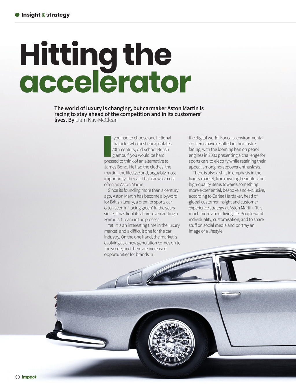 Insight & strategy Hitting the accelerator The world of luxury is changing, but carmaker Aston Martin is racing to stay ahead of the competition and in its customers lives. By Liam Kay-McClean I f you had to choose one ctional character who best encapsulates 20th-century, old-school British glamour, you would be hard pressed to think of an alternative to James Bond. He had the clothes, the martini, the lifestyle and, arguably most importantly, the car. That car was most often an Aston Martin. Since its founding more than a century ago, Aston Martin has become a byword for British luxury, a premier sports car often seen in racing green. In the years since, it has kept its allure, even adding a Formula 1 team in the process. Yet, it is an interesting time in the luxury market, and a diicult one for the car industry. On the one hand, the market is evolving as a new generation comes on to the scene, and there are increased opportunities for brands in the digital world. For cars, environmental concerns have resulted in their lustre fading, with the looming ban on petrol engines in 2030 presenting a challenge for sports cars to electrify while retaining their appeal among horsepower enthusiasts. There is also a shift in emphasis in the luxury market, from owning beautiful and high-quality items towards something more experiential, bespoke and exclusive, according to Carlee Hardaker, head of global customer insight and customer experience strategy at Aston Martin. It is much more about living life. People want individuality, customisation, and to share stu on social media and portray an image of a lifestyle. 30 Impact ISSUE 43 2023_pp30-33 I&S Aston Martin.indd 30 18/09/2023 12:11