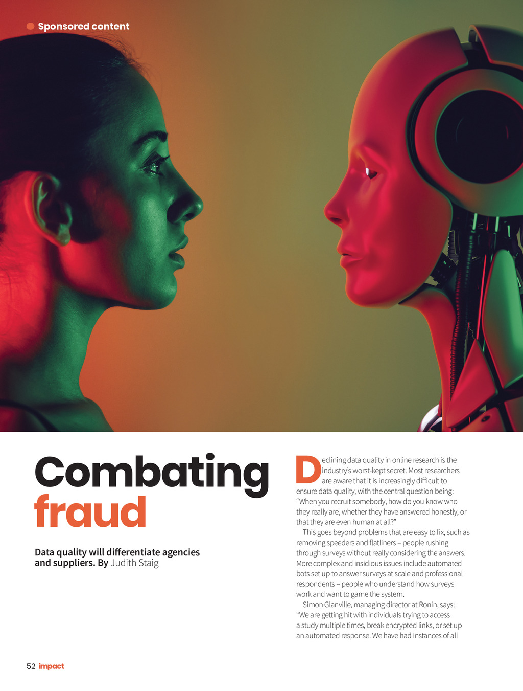Sponsored content Combating D fraud Data quality will differentiate agencies and suppliers. By Judith Staig eclining data quality in online research is the industrys worst-kept secret. Most researchers are aware that it is increasingly difficult to ensure data quality, with the central question being: When you recruit somebody, how do you know who they really are, whether they have answered honestly, or that they are even human at all? This goes beyond problems that are easy to fix, such as removing speeders and flatliners people rushing through surveys without really considering the answers. More complex and insidious issues include automated bots set up to answer surveys at scale and professional respondents people who understand how surveys work and want to game the system. Simon Glanville, managing director at Ronin, says: We are getting hit with individuals trying to access a study multiple times, break encrypted links, or set up an automated response. We have had instances of all 52 Impact ISSUE 43 2023_pp52-53 Ronin Data.indd 52 18/09/2023 12:19
