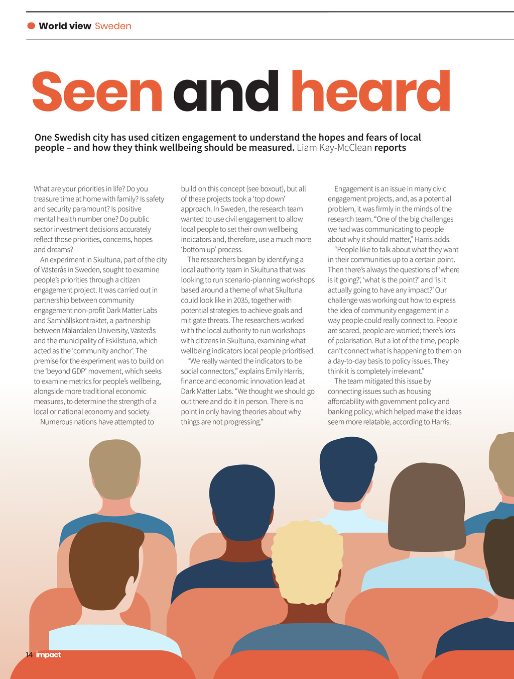 World view Sweden Seen and heard One Swedish city has used citizen engagement to understand the hopes and fears of local people and how they think wellbeing should be measured. Liam Kay-McClean reports What are your priorities in life? Do you treasure time at home with family? Is safety and security paramount? Is positive mental health number one? Do public sector investment decisions accurately reect those priorities, concerns, hopes and dreams? An experiment in Skultuna, part of the city of Vsters in Sweden, sought to examine peoples priorities through a citizen engagement project. It was carried out in partnership between community engagement non-prot Dark Matter Labs and Samhllskontraktet, a partnership between Mlardalen University, Vsters and the municipality of Eskilstuna, which acted as the community anchor. The premise for the experiment was to build on the beyond GDP movement, which seeks to examine metrics for peoples wellbeing, alongside more traditional economic measures, to determine the strength of a local or national economy and society. Numerous nations have attempted to build on this concept (see boxout), but all of these projects took a top down approach. In Sweden, the research team wanted to use civil engagement to allow local people to set their own wellbeing indicators and, therefore, use a much more bottom up process. The researchers began by identifying a local authority team in Skultuna that was looking to run scenario-planning workshops based around a theme of what Skultuna could look like in 2035, together with potential strategies to achieve goals and mitigate threats. The researchers worked with the local authority to run workshops with citizens in Skultuna, examining what wellbeing indicators local people prioritised. We really wanted the indicators to be social connectors, explains Emily Harris, nance and economic innovation lead at Dark Matter Labs. We thought we should go out there and do it in person. There is no point in only having theories about why things are not progressing. Engagement is an issue in many civic engagement projects, and, as a potential problem, it was rmly in the minds of the research team. One of the big challenges we had was communicating to people about why it should matter, Harris adds. People like to talk about what they want in their communities up to a certain point. Then theres always the questions of where is it going?, what is the point? and is it actually going to have any impact? Our challenge was working out how to express the idea of community engagement in a way people could really connect to. People are scared, people are worried; theres lots of polarisation. But a lot of the time, people cant connect what is happening to them on a day-to-day basis to policy issues. They think it is completely irrelevant. The team mitigated this issue by connecting issues such as housing aordability with government policy and banking policy, which helped make the ideas seem more relatable, according to Harris. 14 Impact ISSUE 44 2023_pp14-15 WV Sweden.indd 14 05/12/2023 12:05