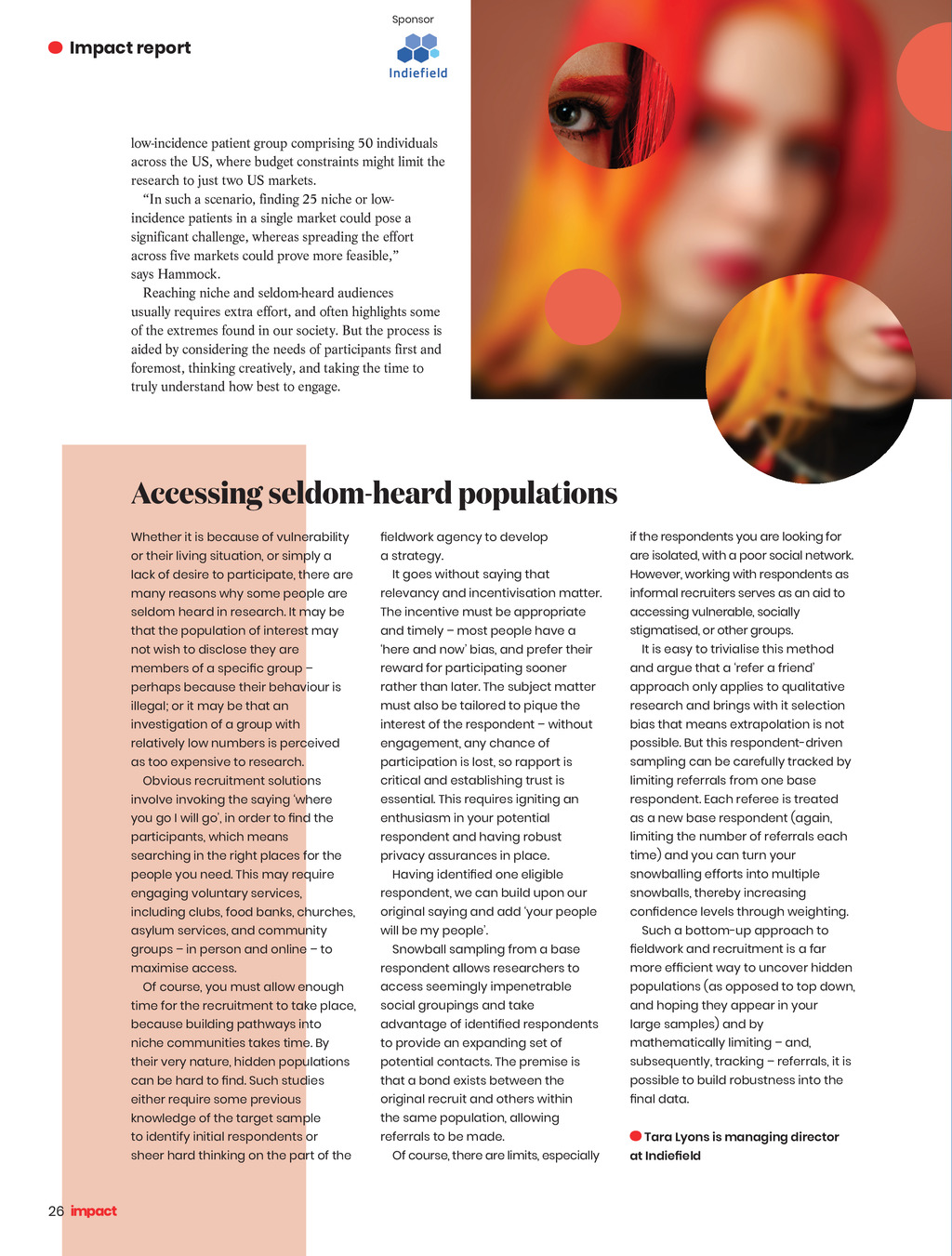 Sponsor Impact report low-incidence patient group comprising 50 individuals across the US, where budget constraints might limit the research to just two US markets. In such a scenario, finding 25 niche or lowincidence patients in a single market could pose a significant challenge, whereas spreading the eort across five markets could prove more feasible, says Hammock. Reaching niche and seldom-heard audiences usually requires extra eort, and often highlights some of the extremes found in our society. But the process is aided by considering the needs of participants first and foremost, thinking creatively, and taking the time to truly understand how best to engage. Accessing seldom-heard populations Whether it is because of vulnerability or their living situation, or simply a lack of desire to participate, there are eldwork agency to develop a strategy. It goes without saying that many reasons why some people are relevancy and incentivisation matter. that the population of interest may and timely most people have a seldom heard in research. It may be not wish to disclose they are members of a specic group perhaps because their behaviour is illegal; or it may be that an investigation of a group with relatively low numbers is perceived as too expensive to research. Obvious recruitment solutions involve invoking the saying where you go I will go, in order to nd the participants, which means searching in the right places for the people you need. This may require The incentive must be appropriate here and now bias, and prefer their engagement, any chance of participation is lost, so rapport is critical and establishing trust is essential. This requires igniting an enthusiasm in your potential respondent and having robust privacy assurances in place. Having identied one eligible original saying and add your people Snowball sampling from a base maximise access. respondent allows researchers to time for the recruitment to take place, social groupings and take niche communities takes time. By their very nature, hidden populations can be hard to nd. Such studies either require some previous knowledge of the target sample to identify initial respondents or sheer hard thinking on the part of the accessing vulnerable, socially stigmatised, or other groups. It is easy to trivialise this method research and brings with it selection interest of the respondent without will be my people. because building pathways into informal recruiters serves as an aid to must also be tailored to pique the rather than later. The subject matter asylum services, and community Of course, you must allow enough However, working with respondents as and argue that a refer a friend respondent, we can build upon our groups in person and online to are isolated, with a poor social network. reward for participating sooner engaging voluntary services, including clubs, food banks, churches, if the respondents you are looking for access seemingly impenetrable advantage of identied respondents to provide an expanding set of potential contacts. The premise is that a bond exists between the original recruit and others within the same population, allowing referrals to be made. Of course, there are limits, especially approach only applies to qualitative bias that means extrapolation is not possible. But this respondent-driven sampling can be carefully tracked by limiting referrals from one base respondent. Each referee is treated as a new base respondent (again, limiting the number of referrals each time) and you can turn your snowballing efforts into multiple snowballs, thereby increasing condence levels through weighting. Such a bottom-up approach to eldwork and recruitment is a far more efcient way to uncover hidden populations (as opposed to top down, and hoping they appear in your large samples) and by mathematically limiting and, subsequently, tracking referrals, it is possible to build robustness into the nal data. Tara Lyons is managing director at Indieeld 26 Impact ISSUE 44 2023_pp20-27_Report.indd 26 07/12/2023 14:52