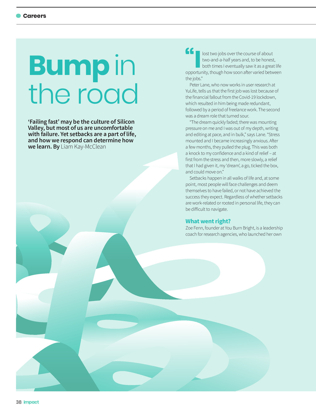 Careers Bump in the road Failing fast may be the culture of Silicon Valley, but most of us are uncomfortable with failure. Yet setbacks are a part of life, and how we respond can determine how we learn. By Liam Kay-McClean I lost two jobs over the course of about two-and-a-half years and, to be honest, both times I eventually saw it as a great life opportunity, though how soon after varied between the jobs. Peter Lane, who now works in user research at YuLife, tells us that the first job was lost because of the financial fallout from the Covid-19 lockdown, which resulted in him being made redundant, followed by a period of freelance work. The second was a dream role that turned sour. The dream quickly faded; there was mounting pressure on me and I was out of my depth, writing and editing at pace, and in bulk, says Lane. Stress mounted and I became increasingly anxious. After a few months, they pulled the plug. This was both a knock to my confidence and a kind of relief at first from the stress and then, more slowly, a relief that I had given it, my dream, a go, ticked the box, and could move on. Setbacks happen in all walks of life and, at some point, most people will face challenges and deem themselves to have failed, or not have achieved the success they expect. Regardless of whether setbacks are work-related or rooted in personal life, they can be difficult to navigate. What went right? Zoe Fenn, founder at You Burn Bright, is a leadership coach for research agencies, who launched her own 38 Impact ISSUE 44 2023_pp38-39_Careers.indd 38 05/12/2023 14:37