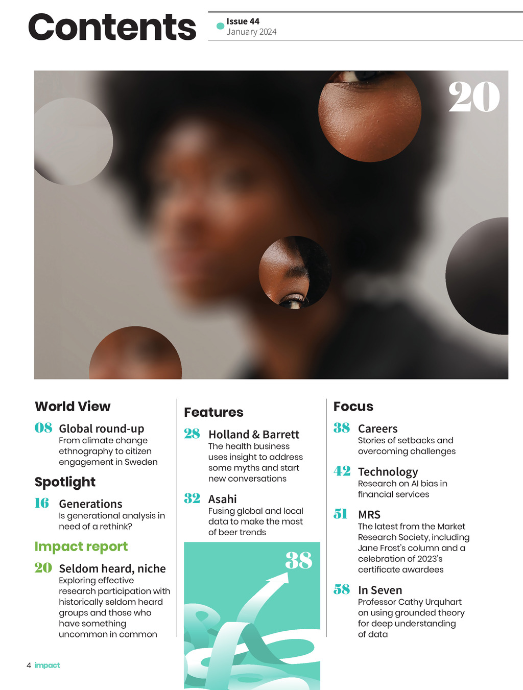 Contents Issue 44 January 2024 20 World View 08Global round-up From climate change ethnography to citizen engagement in Sweden Spotlight 16Generations Is generational analysis in need of a rethink? Impact report 20Seldom heard, niche Exploring effective research participation with historically seldom heard groups and those who have something uncommon in common Focus Features 28Holland & Barrett The health business uses insight to address some myths and start new conversations 32Asahi Fusing global and local data to make the most of beer trends 38 38Careers Stories of setbacks and overcoming challenges 42Technology Research on AI bias in financial services 51MRS The latest from the Market Research Society, including Jane Frosts column and a celebration of 2023s certificate awardees 58In Seven Professor Cathy Urquhart on using grounded theory for deep understanding of data 4 Impact ISSUE 44 2023_pp4-5_contents.indd 4 05/12/2023 11:49