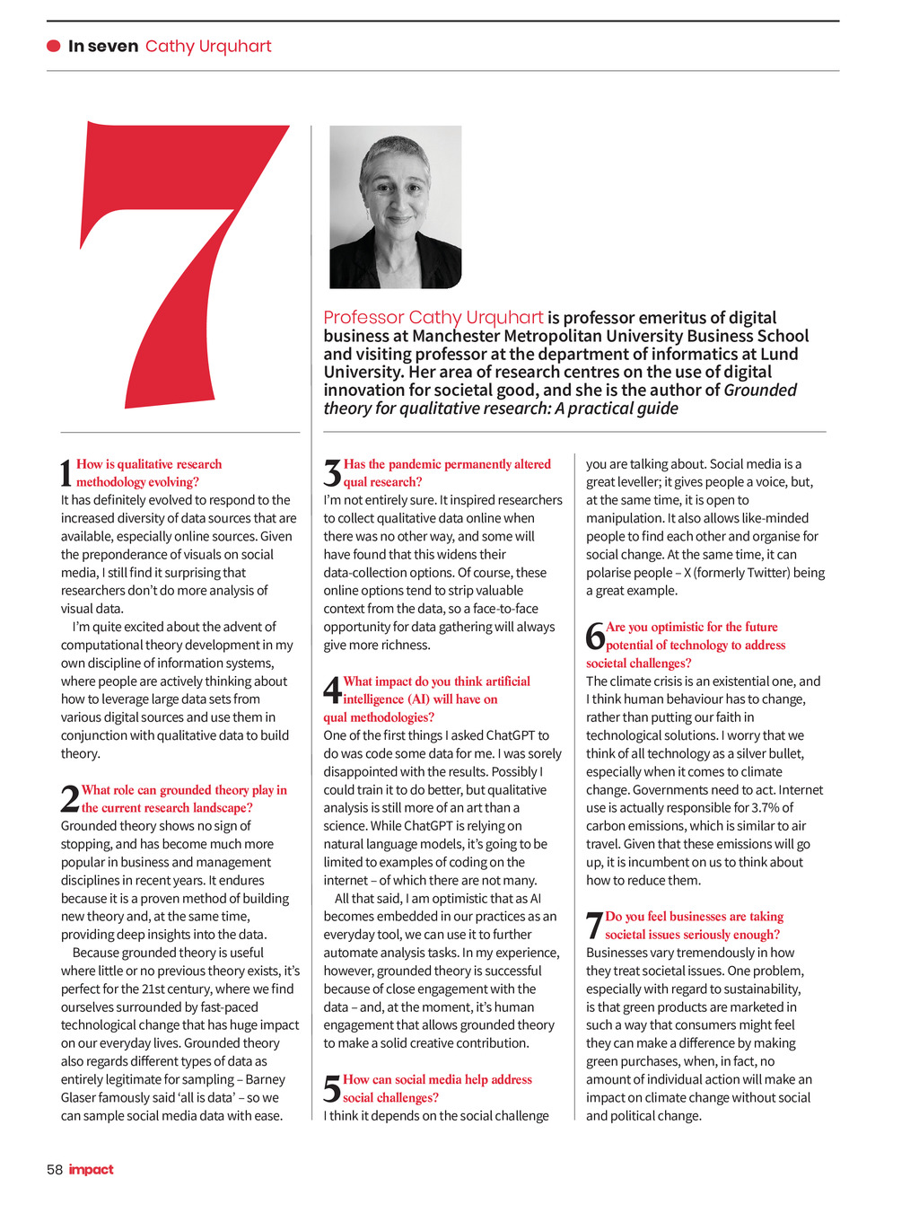 7 In seven Cathy Urquhart 1 How is qualitative research methodology evolving? It has definitely evolved to respond to the increased diversity of data sources that are available, especially online sources. Given the preponderance of visuals on social media, I still find it surprising that researchers dont do more analysis of visual data. Im quite excited about the advent of computational theory development in my own discipline of information systems, where people are actively thinking about how to leverage large data sets from various digital sources and use them in conjunction with qualitative data to build theory. 2 What role can grounded theory play in the current research landscape? Grounded theory shows no sign of stopping, and has become much more popular in business and management disciplines in recent years. It endures because it is a proven method of building new theory and, at the same time, providing deep insights into the data. Because grounded theory is useful where little or no previous theory exists, its perfect for the 21st century, where we find ourselves surrounded by fast-paced technological change that has huge impact on our everyday lives. Grounded theory also regards different types of data as entirely legitimate for sampling Barney Glaser famously said all is data so we can sample social media data with ease. Professor Cathy Urquhart is professor emeritus of digital business at Manchester Metropolitan University Business School and visiting professor at the department of informatics at Lund University. Her area of research centres on the use of digital innovation for societal good, and she is the author of Grounded theory for qualitative research: A practical guide 3 Has the pandemic permanently altered qual research? Im not entirely sure. It inspired researchers to collect qualitative data online when there was no other way, and some will have found that this widens their data-collection options. Of course, these online options tend to strip valuable context from the data, so a face-to-face opportunity for data gathering will always give more richness. 4 What impact do you think artificial intelligence (AI) will have on qual methodologies? One of the first things I asked ChatGPT to do was code some data for me. I was sorely disappointed with the results. Possibly I could train it to do better, but qualitative analysis is still more of an art than a science. While ChatGPT is relying on natural language models, its going to be limited to examples of coding on the internet of which there are not many. All that said, I am optimistic that as AI becomes embedded in our practices as an everyday tool, we can use it to further automate analysis tasks. In my experience, however, grounded theory is successful because of close engagement with the data and, at the moment, its human engagement that allows grounded theory to make a solid creative contribution. 5 How can social media help address social challenges? I think it depends on the social challenge you are talking about. Social media is a great leveller; it gives people a voice, but, at the same time, it is open to manipulation. It also allows like-minded people to find each other and organise for social change. At the same time, it can polarise people X (formerly Twitter) being a great example. 6 Are you optimistic for the future potential of technology to address societal challenges? The climate crisis is an existential one, and I think human behaviour has to change, rather than putting our faith in technological solutions. I worry that we think of all technology as a silver bullet, especially when it comes to climate change. Governments need to act. Internet use is actually responsible for 3.7% of carbon emissions, which is similar to air travel. Given that these emissions will go up, it is incumbent on us to think about how to reduce them. 7 Do you feel businesses are taking societal issues seriously enough? Businesses vary tremendously in how they treat societal issues. One problem, especially with regard to sustainability, is that green products are marketed in such a way that consumers might feel they can make a difference by making green purchases, when, in fact, no amount of individual action will make an impact on climate change without social and political change. 58 Impact ISSUE 44 2023_pp58-60 Seven.indd 58 05/12/2023 12:15