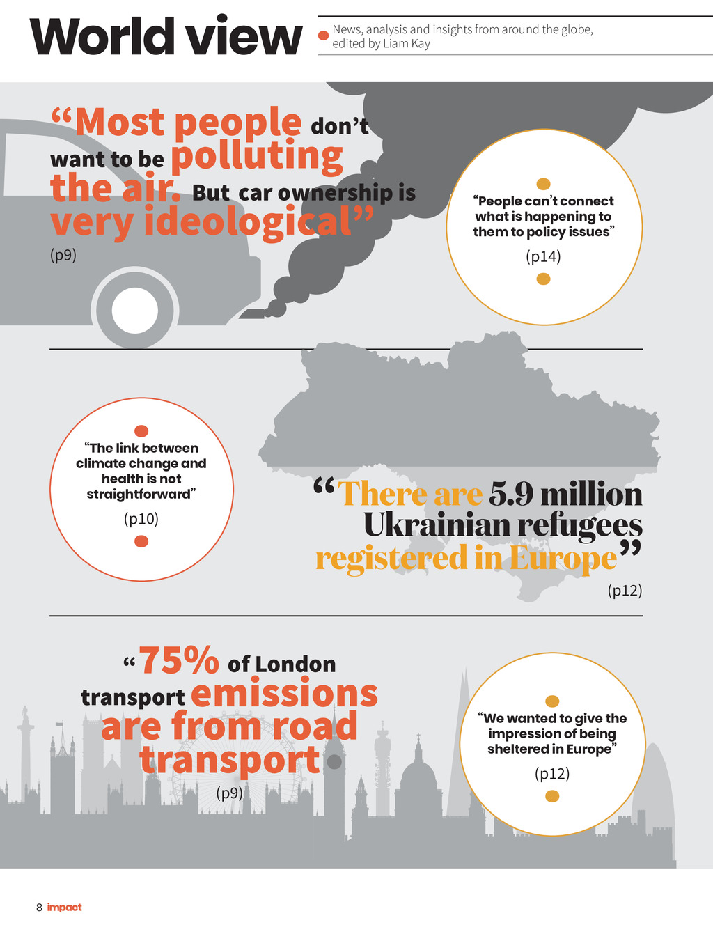 World view News, analysis and insights from around the globe, edited by Liam Kay Most people dont want to be polluting the air. But car ownership is very ideological (p9) The link between climate change and health is not straightforward People cant connect what is happening to them to policy issues (p14) There are 5.9 million Ukrainian refugees registered in Europe (p10) (p12) 75% of London emissions are from road transport transport (p9) We wanted to give the impression of being sheltered in Europe (p12) 8 Impact ISSUE 44 2023_pp8-9_WV Intro an UK.indd 8 05/12/2023 14:34