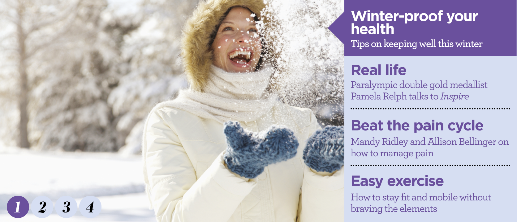 Inside Winter 2016 www.arthritiscare.org.uk winter-proof Our round-up of the latest news and products real life paralympic double gold medallist pamela Relph talks to Inspire Beat the pain cycle Mandy Ridley and allison Bellinger on how to manage pain easy exercise 1 2 How to stay fit and mobile without braving the elements 34 health news Get inspired! ...with issue 16 energy levels ask the doctor lets get together How to donate arthritis diary talking to your Gp Get involved! letters self news recipes apos therapy relationships winter-proof Our round-up of the latest news and products real life Paralympic double gold medallist Pamela Relph talks to Inspire Beat the pain cycle Mandy Ridley and allison Bellinger on how to manage pain easy exercise 1 2 34 How to stay fit and mobile without braving the elements winter-proof Our round-up of the latest news and products real life paralympic double gold medallist pamela Relph talks to Inspire Beat the pain cycle Mandy Ridley and Allison Bellinger on how to manage pain easy exercise 1 2 34 How to stay fit and mobile without braving the elements winter-proof Our round-up of the latest news and products real life paralympic double gold medallist pamela Relph talks to Inspire Beat the pain cycle Mandy Ridley and allison Bellinger on how to manage pain easy exercise 34 How to stay fit and mobile without braving the elements