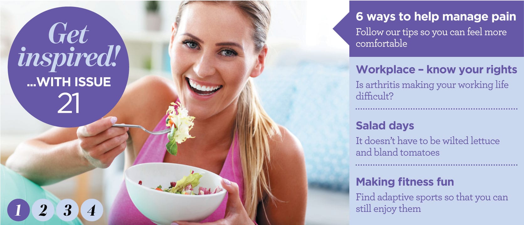 Inside Spring 2018 arthritiscare.org.uk 6 ways to help manage pain Get inspired! Follow our tips so you can feel more comfortable workplace know your rights ...with issue Is arthritis making your working life difficult? 21 salad days It doesnt have to be wilted lettuce and bland tomatoes making fitness fun 1 2 Find adaptive sports so that you can still enjoy them 34 your best health resolutions health news letters neck arthritis your treatment ask the doctor ask the expert arthritis diary a Day in the life get involved! helpline