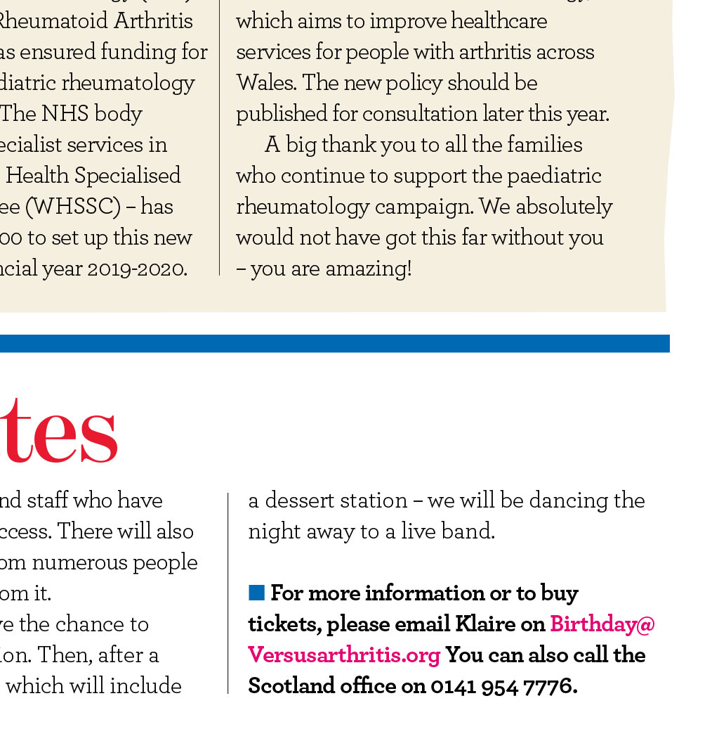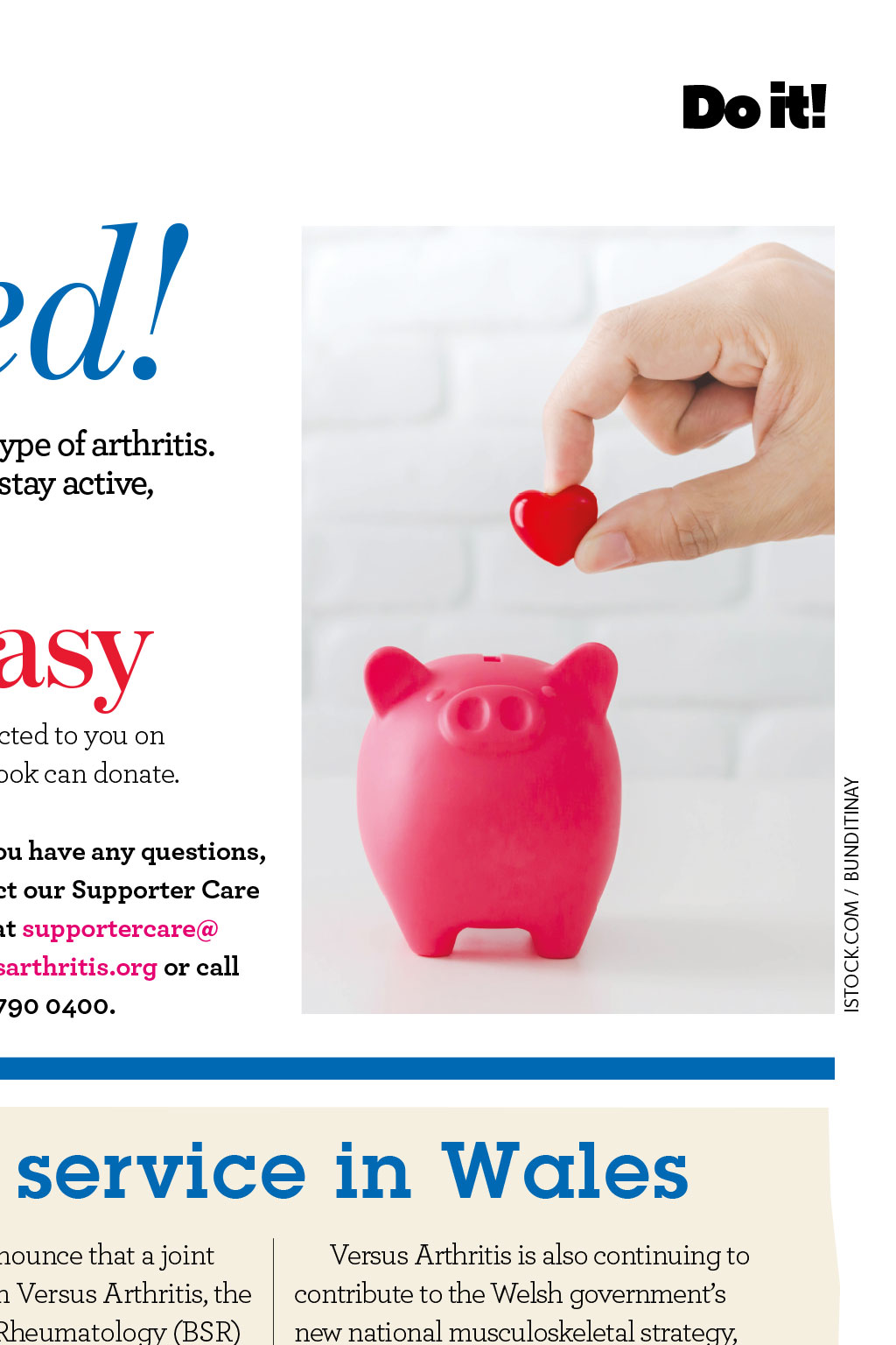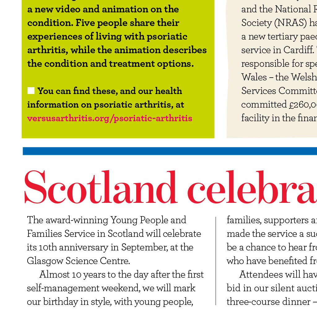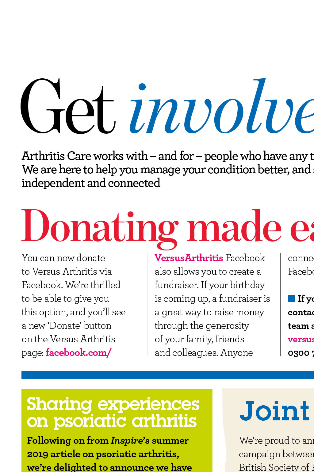 o it! Get involved! Arthritis Care works with and for people who have any type of arthritis. We are here to help you manage your condition better, and stay active, independent and connected Donating made easy VersusArthritis Facebook also allows you to create a fundraiser. If your birthday is coming up, a fundraiser is a great way to raise money through the generosity of your family, friends and colleagues. Anyone connected to you on Facebook can donate. ISTOCK.COM / BUNDITINAY You can now donate to Versus Arthritis via Facebook. Were thrilled to be able to give you this option, and youll see a new Donate button on the Versus Arthritis page: facebook.com/ If you have any questions, contact our Supporter Care team at supportercare@ versusarthritis.org or call 0300 790 0400. Sharing experiences on psoriatic arthritis Joint service in Wales Following on from Inspires summer 2019 article on psoriatic arthritis, were delighted to announce we have a new video and animation on the condition. Five people share their experiences of living with psoriatic arthritis, while the animation describes the condition and treatment options. Were proud to announce that a joint campaign between Versus Arthritis, the British Society of Rheumatology (BSR) and the National Rheumatoid Arthritis Society (NRAS) has ensured funding for a new tertiary paediatric rheumatology service in Cardiff. The NHS body responsible for specialist services in Wales the Welsh Health Specialised Services Committee (WHSSC) has committed 260,000 to set up this new facility in the financial year 2019-2020. You can find these, and our health information on psoriatic arthritis, at versusarthritis.org/psoriatic-arthritis Scotland celebrates The award-winning Young People and Families Service in Scotland will celebrate its 10th anniversary in September, at the Glasgow Science Centre. Almost 10 years to the day after the first self-management weekend, we will mark our birthday in style, with young people, families, supporters and staff who have made the service a success. There will also be a chance to hear from numerous people who have benefited from it. Attendees will have the chance to bid in our silent auction. Then, after a three-course dinner which will include Versus Arthritis is also continuing to contribute to the Welsh governments new national musculoskeletal strategy, which aims to improve healthcare services for people with arthritis across Wales. The new policy should be published for consultation later this year. A big thank you to all the families who continue to support the paediatric rheumatology campaign. We absolutely would not have got this far without you you are amazing! a dessert station we will be dancing the night away to a live band. For more information or to buy tickets, please email Klaire on Birthday@ Versusarthritis.org You can also call the Scotland office on 0141 954 7776.
