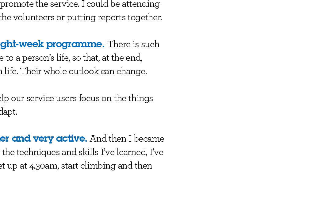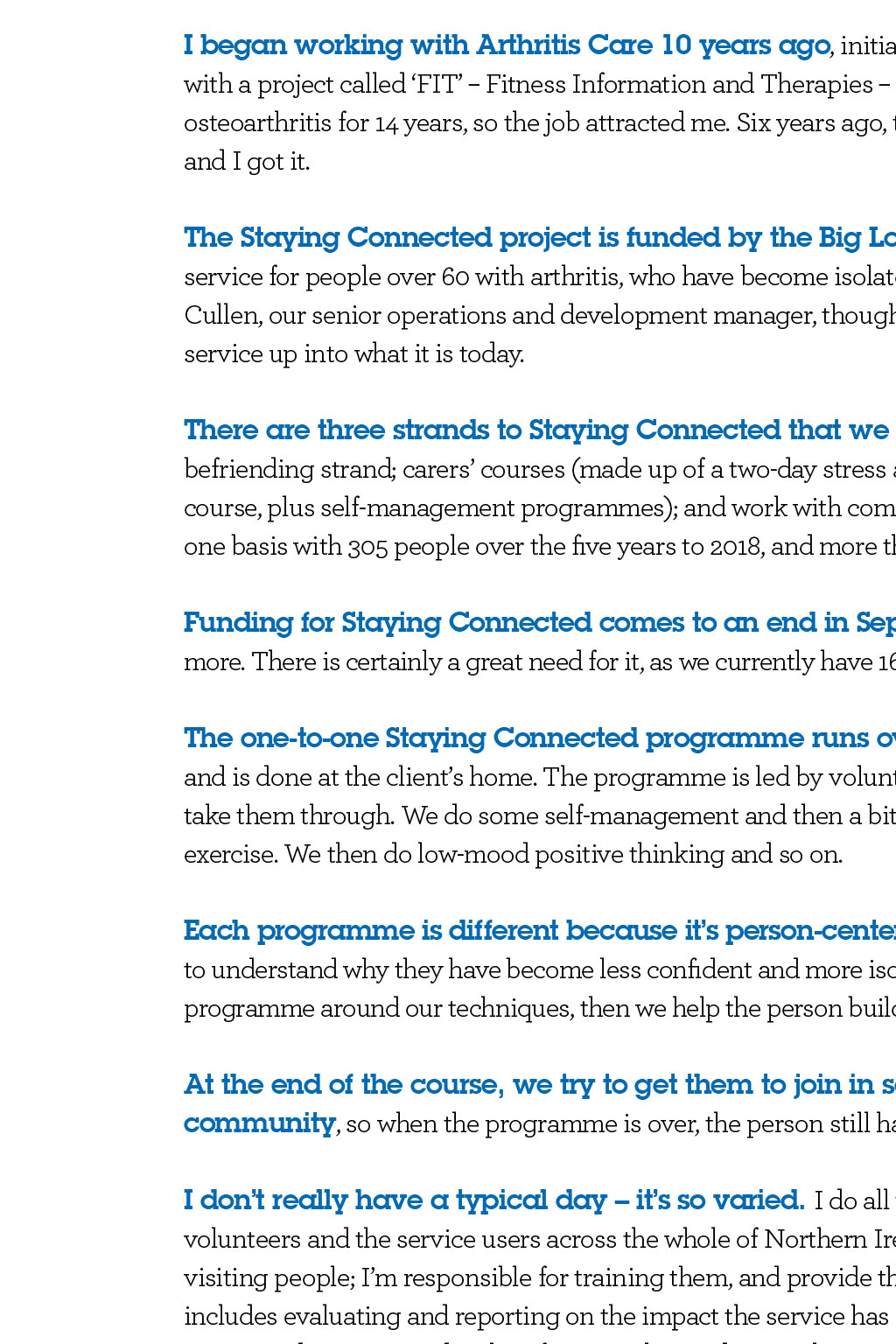 Day in the life Their whole outlook can change Belfast-based Mary McConville is the service manager for Versus Arthritiss Staying Connected in Later Life programme AS TOLD TO: PHIL LATTIMORE I began working with Arthritis Care 10 years ago, initially in a part-time role as an administrator with a project called FIT Fitness Information and Therapies to help people with arthritis. Ive had osteoarthritis for 14 years, so the job attracted me. Six years ago, the job for Staying Connected came up, and I got it. The Staying Connected project is funded by the Big Lottery. Its a mentoring and befriending service for people over 60 with arthritis, who have become isolated because of their condition. Ailish Cullen, our senior operations and development manager, thought of the idea. I then helped build the service up into what it is today. There are three strands to Staying Connected that we deliver: the one-to-one mentoring and befriending strand; carers courses (made up of a two-day stress and emotional wellbeing management course, plus self-management programmes); and work with community groups. We worked on a one-toone basis with 305 people over the five years to 2018, and more than 1,500 people in other ways. Funding for Staying Connected comes to an end in September, but were hoping well secure more. There is certainly a great need for it, as we currently have 169 people on our waiting list for the service. The one-to-one Staying Connected programme runs over eight weeks, for one hour a week, and is done at the clients home. The programme is led by volunteers and there are 14 techniques that we take them through. We do some self-management and then a bit of physical activity, such as chair-based exercise. We then do low-mood positive thinking and so on. Each programme is different because its person-centered. We listen to what people have to say, to understand why they have become less confident and more isolated, and we build on that. We develop a programme around our techniques, then we help the person build up their confidence and self-esteem. At the end of the course, we try to get them to join in some activities in their local community, so when the programme is over, the person still has a connection. I dont really have a typical day its so varied. I do all the initial introductory visits with my volunteers and the service users across the whole of Northern Ireland. We have around 30 volunteers visiting people; Im responsible for training them, and provide their support and supervision. My role also includes evaluating and reporting on the impact the service has made, plus budget management, and events and activities. I do a lot of partnership and networking to promote the service. I could be attending events, liaising with partners, running workshops, working with the volunteers or putting reports together. Its wonderful to see where a person gets to over the eight-week programme. There is such reward in helping people and seeing the difference you can make to a persons life, so that, at the end, theyre more confident, motivated and have a positive outlook on life. Their whole outlook can change. Arthritis has an impact on peoples lives. But we try to help our service users focus on the things they can still do perhaps with a few changes and help them adapt. When I was first diagnosed with arthritis, I was a runner and very active. And then I became very inactive. But with self management, and taking on board all the techniques and skills Ive learned, Ive started hill climbing again. Its really good particularly if you get up at 4.30am, start climbing and then watch the sun rise over the mountains.