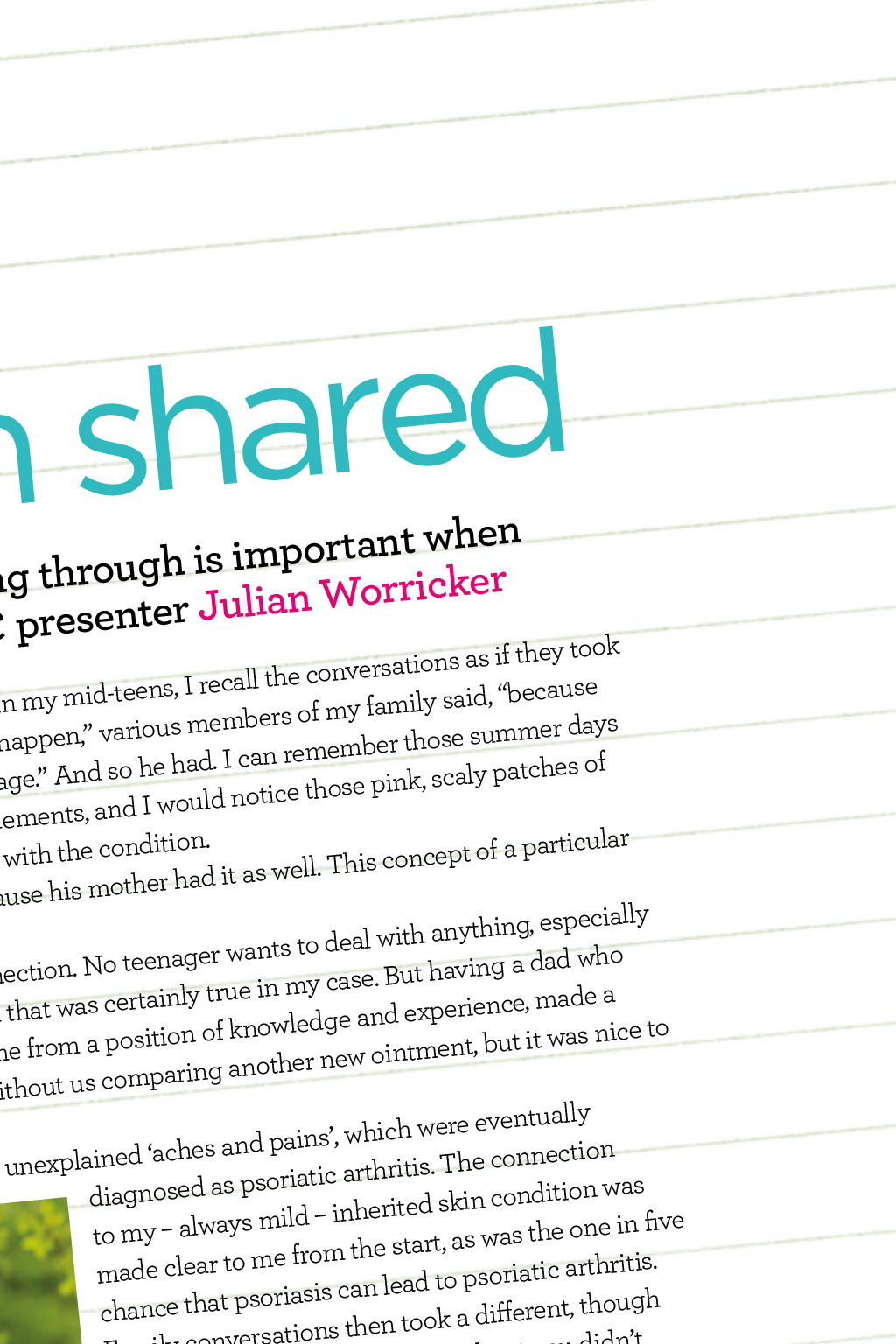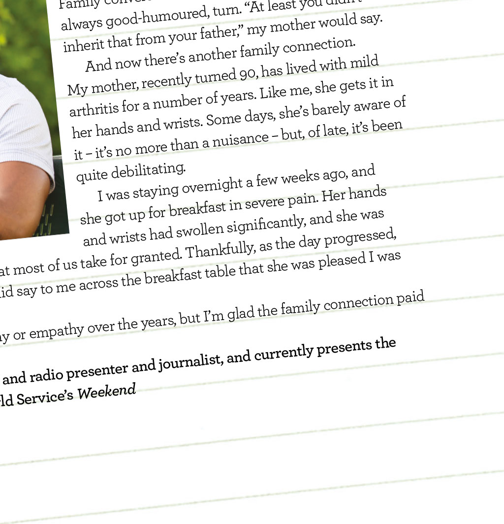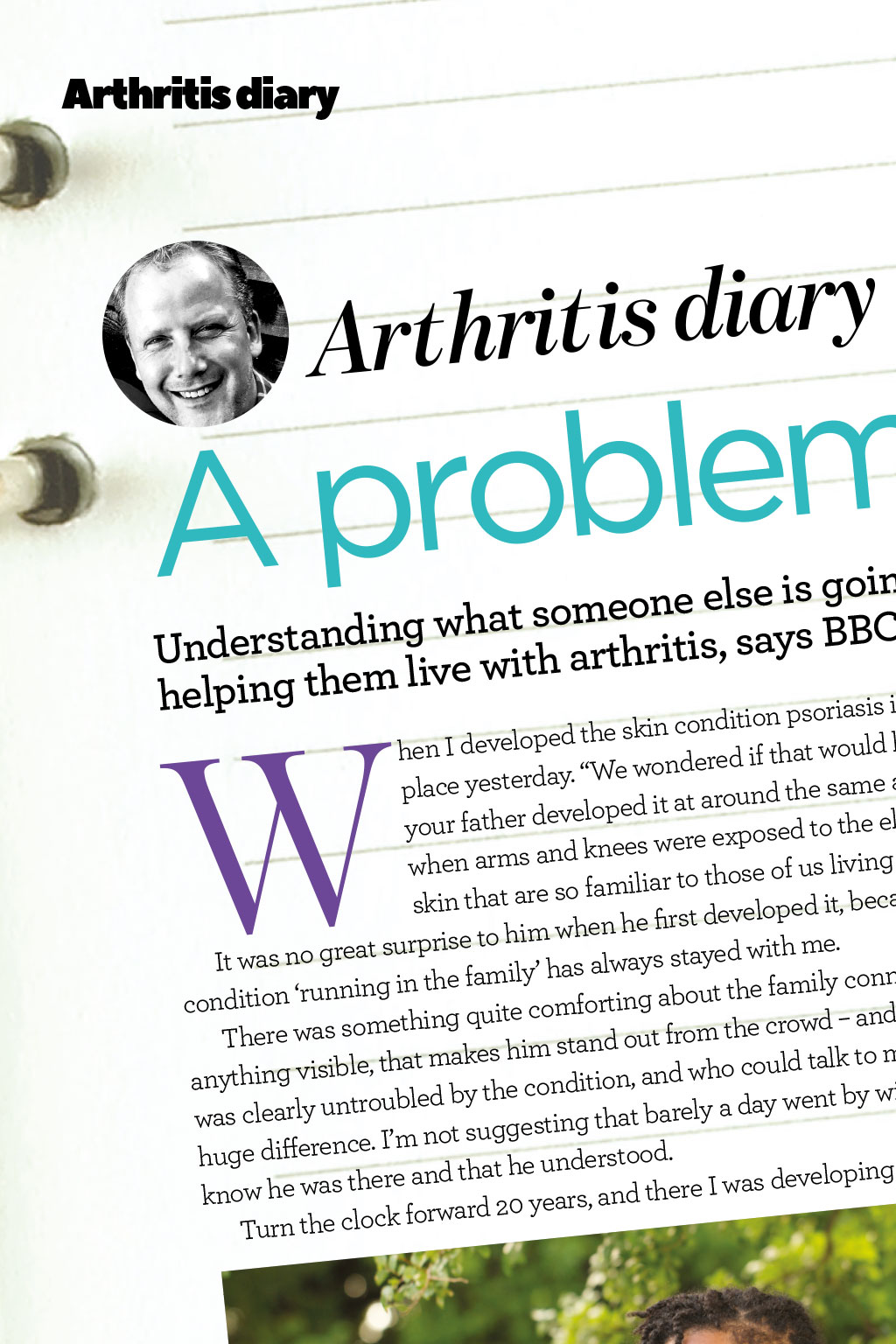 Arthritis diary A problem shared Understanding what someone else is going through is important when Whelping them live with arthritis, says BBC presenter Julian Worricker When I developed the skin condition psoriasis in my mid-teens, I recall the conversations as if they took place yesterday. “We wondered if that would happen,” various members of my family said, “because your father developed it at around the same age.” And so he had. I can remember those summer days when arms and knees were exposed to the elements, and I would notice those pink, scaly patches of skin that are so familiar to those of us living with the condition. It was no great surprise to him when he first developed it, because his mother had it as well. This concept of a particular condition ‘running in the family’ has always stayed with me. There was something quite comforting about the family connection. No teenager wants to deal with anything, especially anything visible, that makes him stand out from the crowd – and that was certainly true in my case. But having a dad who was clearly untroubled by the condition, and who could talk to me from a position of knowledge and experience, made a huge difference. I’m not suggesting that barely a day went by without us comparing another new ointment, but it was nice to know he was there and that he understood. Turn the clock forward 20 years, and there I was developing unexplained ‘aches and pains’, which were eventually diagnosed as psoriatic arthritis. The connection to my – always mild – inherited skin condition was made clear to me from the start, as was the one in five chance that psoriasis can lead to psoriatic arthritis. Family conversations then took a different, though always good-humoured, turn. “At least you didn’t inherit that from your father,” my mother would say. And now there’s another family connection. My mother, recently turned 90, has lived with mild arthritis for a number of years. Like me, she gets it in her hands and wrists. Some days, she’s barely aware of it – it’s no more than a nuisance – but, of late, it’s been quite debilitating. I was staying overnight a few weeks ago, and she got up for breakfast in severe pain. Her hands and wrists had swollen significantly, and she was struggling to do all those mundane morning activities that most of us take for granted. Thankfully, as the day progressed, she improved, and there’s been no repeat since. But she did say to me across the breakfast table that she was pleased I was there, because I knew what it felt like. I’ve not always received top marks for either sympathy or empathy over the years, but I’m glad the family connection paid dividends on this particular occasion. Julian Worricker has psoriatic arthritis. He is a TV and radio presenter and journalist, and currently presents the BBC News channel’s rolling news and the BBC World Service’s Weekend