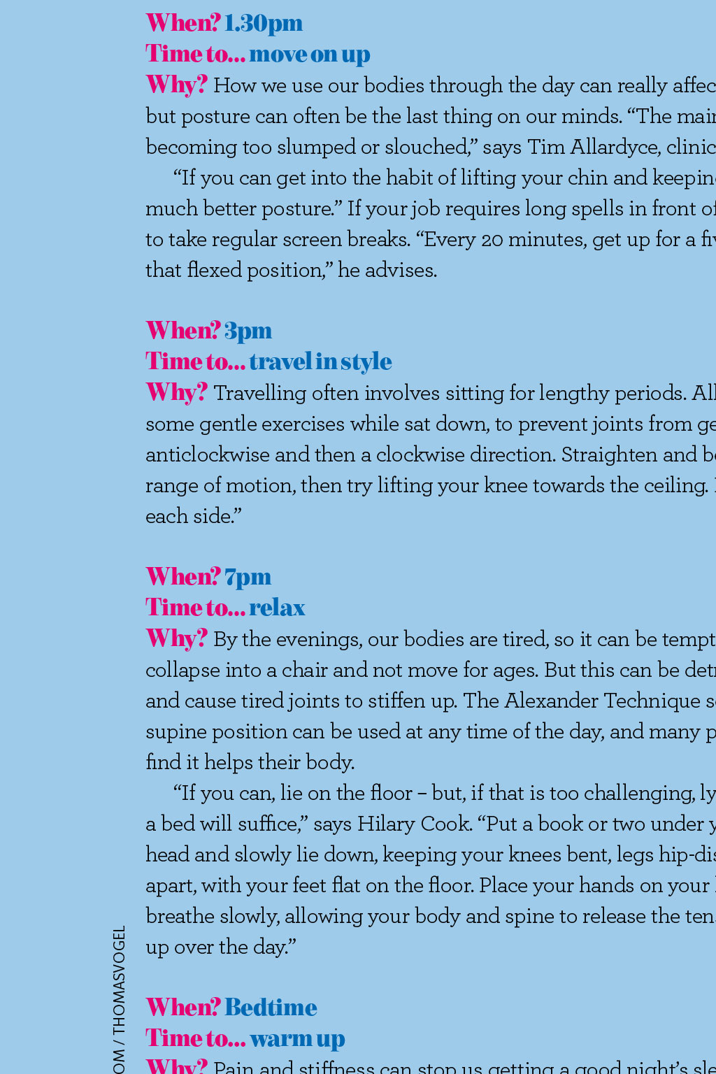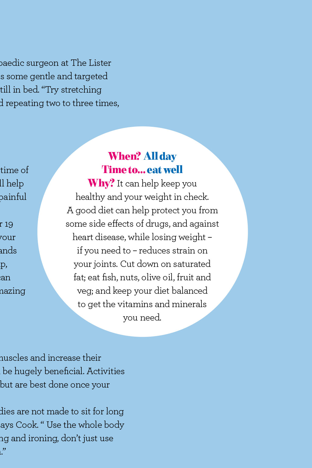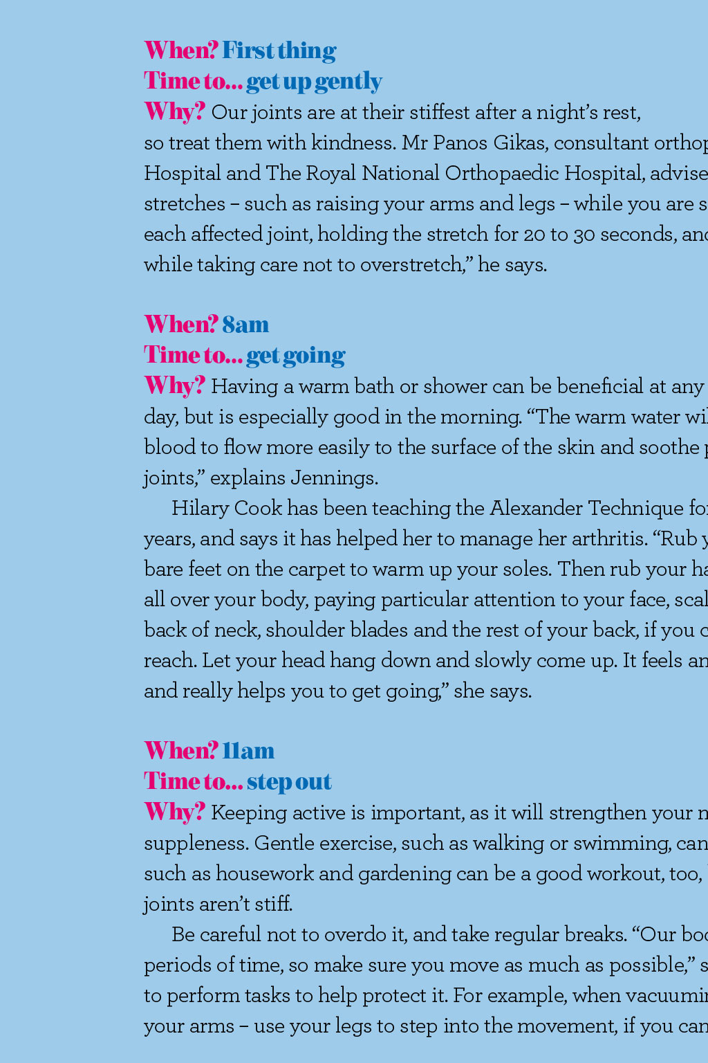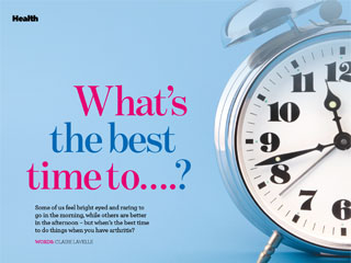 Health Whats the best time to.? Some of us feel bright eyed and raring to go in the morning, while others are better in the afternoon but whens the best time to do things when you have arthritis? WORDS: CLAIRE LAVELLE When? First thing Time to get up gently Why? Our joints are at their stiffest after a nights rest, so treat them with kindness. Mr Panos Gikas, consultant orthopaedic surgeon at The Lister Hospital and The Royal National Orthopaedic Hospital, advises some gentle and targeted stretches such asraising your arms and legs while you are still in bed. Try stretching eachaffected joint, holding the stretch for 20 to 30 seconds, and repeating two to three times, while taking care not to overstretch, he says. When? 8am Time to get going Why? Having a warm bath or shower can be beneficial at any time of day, but is especially good in the morning. The warm water will help blood to flow more easily to the surface of the skin and soothe painful joints, explains Jennings. Hilary Cook has been teaching the Alexander Technique for 19 years, and says it has helped her to manage her arthritis. Rub your bare feet on the carpet to warm up your soles. Then rub your hands all over your body, paying particular attention to your face, scalp, back of neck, shoulder blades and the rest of your back, if you can reach. Let your head hang down and slowly come up. Itfeels amazing and really helps you to get going, she says. When? All day Time to eat well Why? It can help keep you healthy and your weight in check. A good diet can help protect you from some side effects of drugs, and against heart disease, while losing weight if you need to reduces strain on your joints. Cut down on saturated fat; eat fish, nuts, olive oil, fruit and veg; and keep your diet balanced to get the vitamins and minerals you need. When? 11am Time to... step out Why? Keeping active is important, as it will strengthen your muscles and increase their suppleness. Gentle exercise, such as walking or swimming, can be hugely beneficial. Activities such as housework and gardening can be a good workout, too, but are best done once your joints arent stiff. Be careful not to overdo it, and take regular breaks. Our bodies are not made to sit for long periods of time, so make sure you move as much as possible, says Cook. Use the whole body to perform tasks to help protect it. For example, when vacuuming and ironing, dont just use your arms use your legs to step into the movement, ifyou can. When? 1.30pm Time to move on up Why? How we use our bodies through the day can really affect the pain we feel in the evening, but posture can often be the last thing on our minds. The main thing to remember is to avoid becoming too slumped or slouched, says Tim Allardyce, clinical director at Surrey Physio. If you can get into the habit of lifting your chin and keeping your head straight, youll have much better posture. If your job requires long spells in front of a computer, its important totake regular screen breaks. Every 20minutes, get up for a five-minute walk toget you out of that flexed position, he advises. When? 3pm Time to travel in style Why? Travelling often involves sitting for lengthy periods. Allardyce recommends doing some gentle exercises while sat down, to prevent joints from getting stiff. Rotate your feet in an anticlockwise and then a clockwise direction. Straighten and bend your knee to increase your range of motion, then try lifting your knee towards the ceiling. Repeat each exercise 10 times on each side. ISTOCK.COM / THOMASVOGEL When? 7pm Time to relax Why? By the evenings, our bodies are tired, so it can be tempting to collapse into a chair and not move for ages. But this can be detrimental and cause tired joints to stiffen up. The Alexander Technique semisupine position can be used at any time of the day, and many people find it helps their body. If you can, lie on the floor but, if that is too challenging, lying on a bed will suffice, says Hilary Cook. Put a book or two under your head and slowly lie down, keeping your knees bent, legs hip-distance apart, with your feet flat onthe floor. Place your hands on your hips and breathe slowly, allowing your body and spine to release the tension built up over the day. When? All day Time to keep hydrated Why? Drinking plenty of water will keep your joints functioning well, flush out toxins and help with fatigue. When you become dehydrated, your body begins to take water from other areas of the body, including joints. The loss of water from joints allows toxins to linger, leading to pain and inflammation, says Julie Jennings, independent occupational therapist at HSL Chairs. When? Bedtime Time to... warm up Why? Pain and stiffness can stop us getting a good nights sleep. I recommend heat therapy at night before bed, such as a soak in the bath or using a heat pad for 15 minutes, says Panos Gikas. This should make it a little easier and more comfortable to fall asleep.