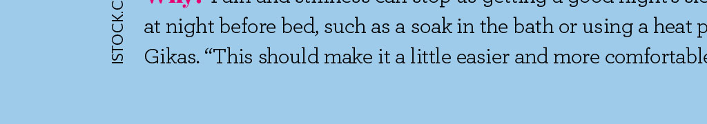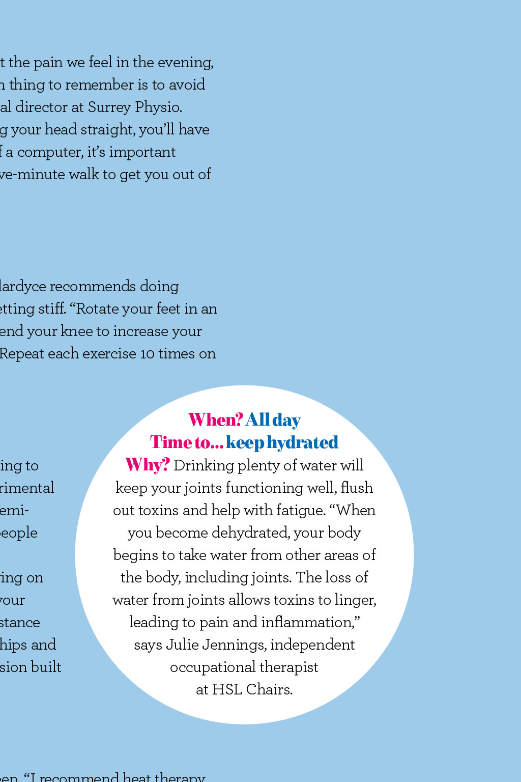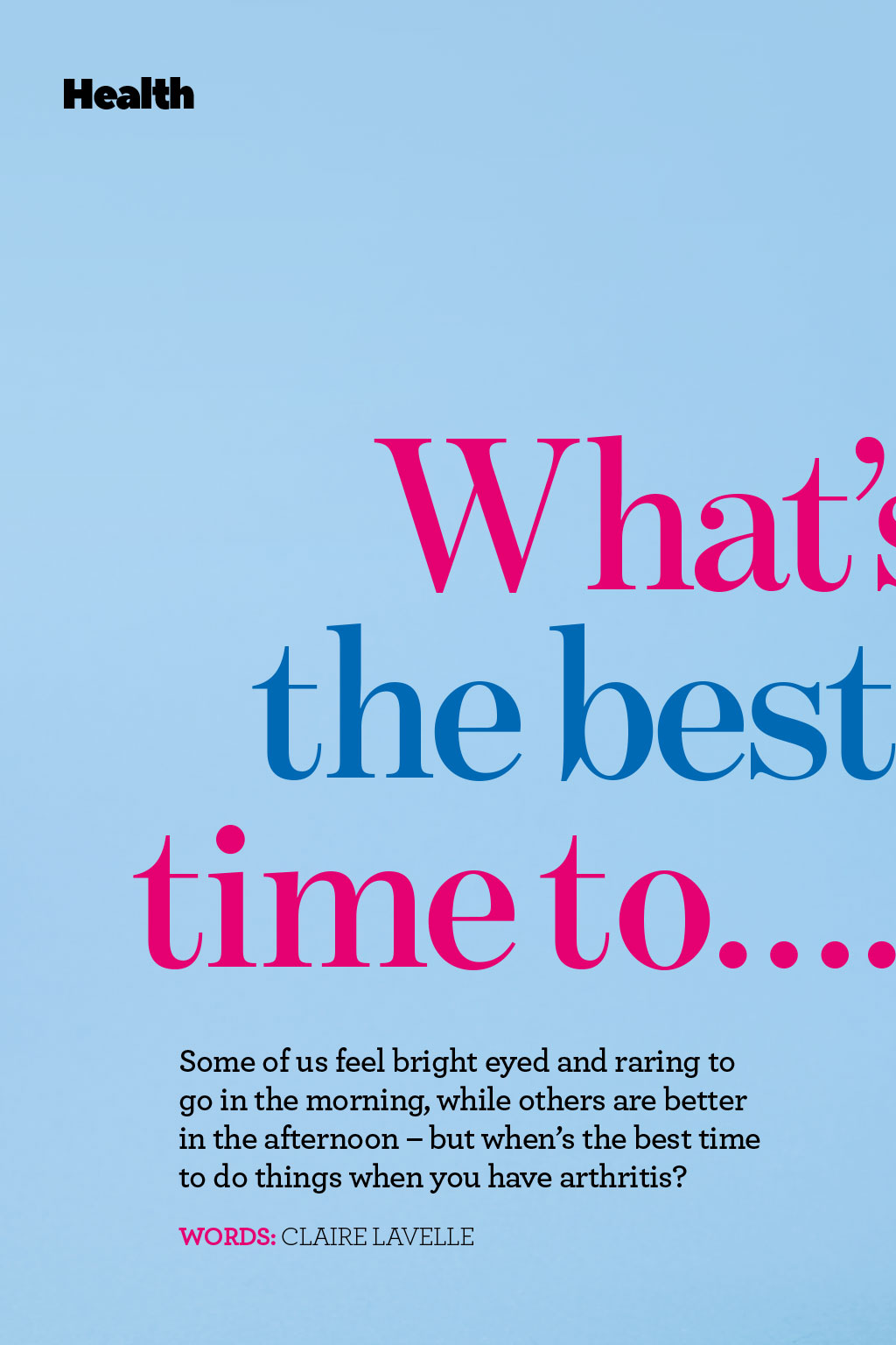 Health Whats the best time to.? Some of us feel bright eyed and raring to go in the morning, while others are better in the afternoon but whens the best time to do things when you have arthritis? WORDS: CLAIRE LAVELLE When? First thing Time to get up gently Why? Our joints are at their stiffest after a nights rest, so treat them with kindness. Mr Panos Gikas, consultant orthopaedic surgeon at The Lister Hospital and The Royal National Orthopaedic Hospital, advises some gentle and targeted stretches such asraising your arms and legs while you are still in bed. Try stretching eachaffected joint, holding the stretch for 20 to 30 seconds, and repeating two to three times, while taking care not to overstretch, he says. When? 8am Time to get going Why? Having a warm bath or shower can be beneficial at any time of day, but is especially good in the morning. The warm water will help blood to flow more easily to the surface of the skin and soothe painful joints, explains Jennings. Hilary Cook has been teaching the Alexander Technique for 19 years, and says it has helped her to manage her arthritis. Rub your bare feet on the carpet to warm up your soles. Then rub your hands all over your body, paying particular attention to your face, scalp, back of neck, shoulder blades and the rest of your back, if you can reach. Let your head hang down and slowly come up. Itfeels amazing and really helps you to get going, she says. When? All day Time to eat well Why? It can help keep you healthy and your weight in check. A good diet can help protect you from some side effects of drugs, and against heart disease, while losing weight if you need to reduces strain on your joints. Cut down on saturated fat; eat fish, nuts, olive oil, fruit and veg; and keep your diet balanced to get the vitamins and minerals you need. When? 11am Time to... step out Why? Keeping active is important, as it will strengthen your muscles and increase their suppleness. Gentle exercise, such as walking or swimming, can be hugely beneficial. Activities such as housework and gardening can be a good workout, too, but are best done once your joints arent stiff. Be careful not to overdo it, and take regular breaks. Our bodies are not made to sit for long periods of time, so make sure you move as much as possible, says Cook. Use the whole body to perform tasks to help protect it. For example, when vacuuming and ironing, dont just use your arms use your legs to step into the movement, ifyou can. When? 1.30pm Time to move on up Why? How we use our bodies through the day can really affect the pain we feel in the evening, but posture can often be the last thing on our minds. The main thing to remember is to avoid becoming too slumped or slouched, says Tim Allardyce, clinical director at Surrey Physio. If you can get into the habit of lifting your chin and keeping your head straight, youll have much better posture. If your job requires long spells in front of a computer, its important totake regular screen breaks. Every 20minutes, get up for a five-minute walk toget you out of that flexed position, he advises. When? 3pm Time to travel in style Why? Travelling often involves sitting for lengthy periods. Allardyce recommends doing some gentle exercises while sat down, to prevent joints from getting stiff. Rotate your feet in an anticlockwise and then a clockwise direction. Straighten and bend your knee to increase your range of motion, then try lifting your knee towards the ceiling. Repeat each exercise 10 times on each side. ISTOCK.COM / THOMASVOGEL When? 7pm Time to relax Why? By the evenings, our bodies are tired, so it can be tempting to collapse into a chair and not move for ages. But this can be detrimental and cause tired joints to stiffen up. The Alexander Technique semisupine position can be used at any time of the day, and many people find it helps their body. If you can, lie on the floor but, if that is too challenging, lying on a bed will suffice, says Hilary Cook. Put a book or two under your head and slowly lie down, keeping your knees bent, legs hip-distance apart, with your feet flat onthe floor. Place your hands on your hips and breathe slowly, allowing your body and spine to release the tension built up over the day. When? All day Time to keep hydrated Why? Drinking plenty of water will keep your joints functioning well, flush out toxins and help with fatigue. When you become dehydrated, your body begins to take water from other areas of the body, including joints. The loss of water from joints allows toxins to linger, leading to pain and inflammation, says Julie Jennings, independent occupational therapist at HSL Chairs. When? Bedtime Time to... warm up Why? Pain and stiffness can stop us getting a good nights sleep. I recommend heat therapy at night before bed, such as a soak in the bath or using a heat pad for 15 minutes, says Panos Gikas. This should make it a little easier and more comfortable to fall asleep.