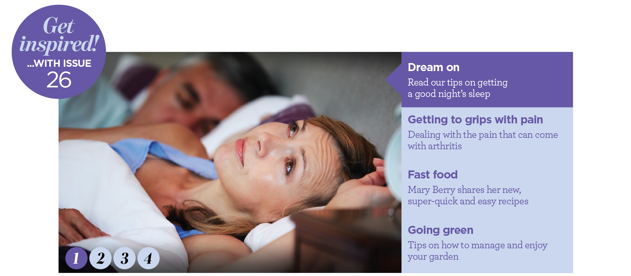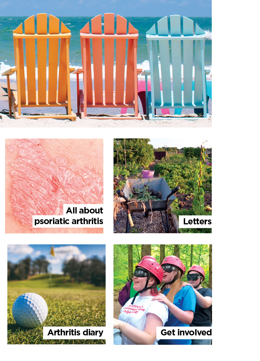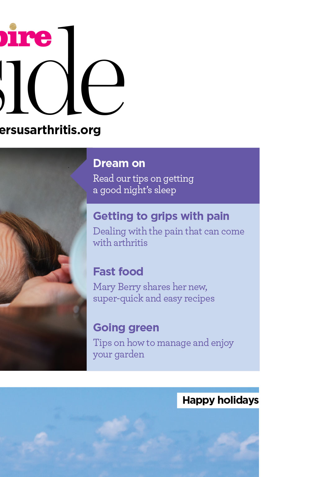 Inside Get inspired! Summer 2019 versusarthritis.org ...WITH ISSUE Dream on 26 Read our tips on getting a good nights sleep Getting to grips with pain Dealing with the pain that can come with arthritis Fast food Mary Berry shares her new, super-quick and easy recipes Going green 1 2 Tips on how to manage and enjoy your garden 3 4 Happy holidays Fitness Day in the life All about psoriasis Letters Ask the experts Health news Arthritis diary Get involved