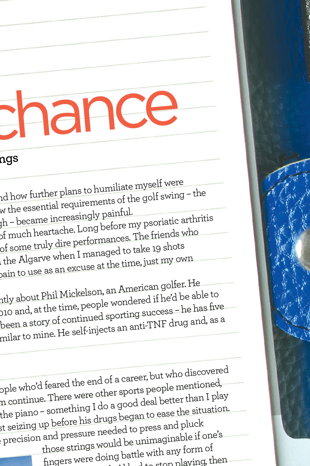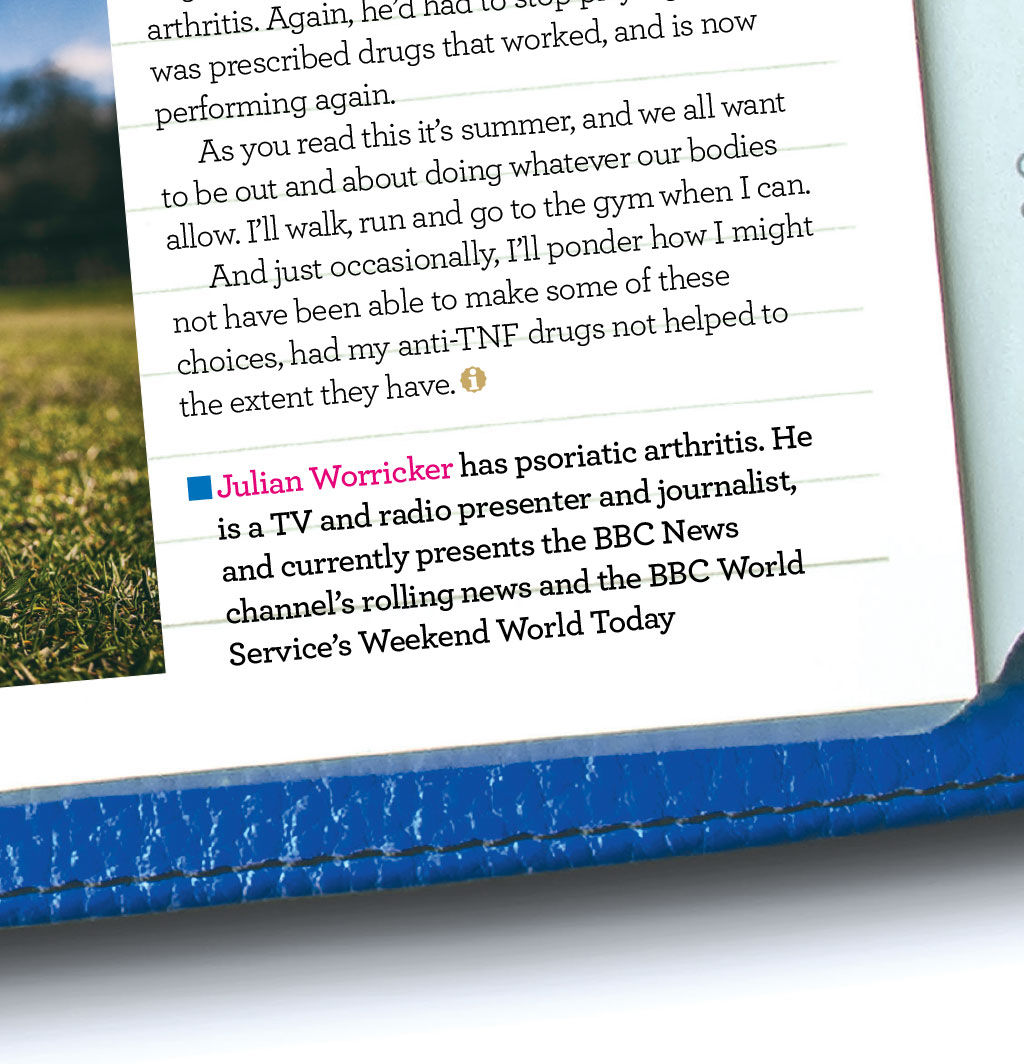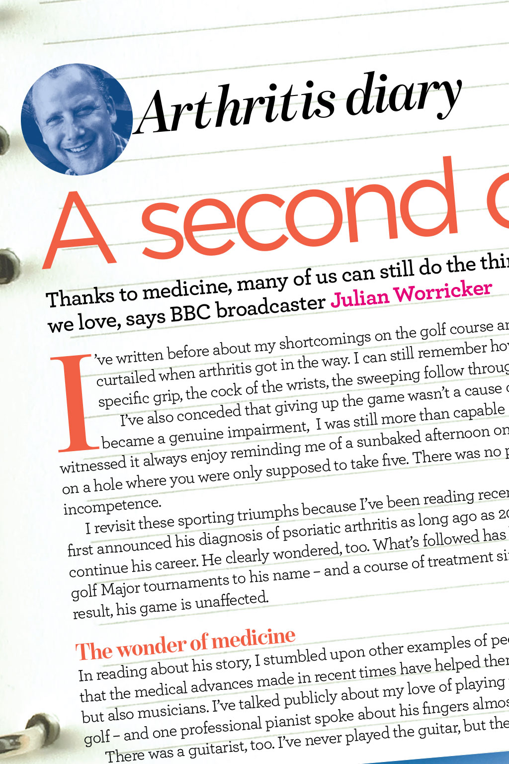 Arthritis diary A second chance Thanks to medicine, many of us can still do the things Iwe love, says BBC broadcaster Julian Worricker ’ve written before about my shortcomings on the golf course and how further plans to humiliate myself were curtailed when arthritis got in the way. I can still remember how the essential requirements of the golf swing – the specific grip, the cock of the wrists, the sweeping follow through – became increasingly painful. I’ve also conceded that giving up the game wasn’t a cause of much heartache. Long before my psoriatic arthritis became a genuine impairment, I was still more than capable of some truly dire performances. The friends who witnessed it always enjoy reminding me of a sunbaked afternoon on the Algarve when I managed to take 19 shots on a hole where you were only supposed to take five. There was no pain to use as an excuse at the time, just my own incompetence. I revisit these sporting triumphs because I’ve been reading recently about Phil Mickelson, an American golfer. He first announced his diagnosis of psoriatic arthritis as long ago as 2010 and, at the time, people wondered if he’d be able to continue his career. He clearly wondered, too. What’s followed has been a story of continued sporting success – he has five golf Major tournaments to his name – and a course of treatment similar to mine. He self-injects an anti-TNF drug and, as a result, his game is unaffected. The wonder of medicine In reading about his story, I stumbled upon other examples of people who’d feared the end of a career, but who discovered that the medical advances made in recent times have helped them continue. There were other sports people mentioned, but also musicians. I’ve talked publicly about my love of playing the piano – something I do a good deal better than I play golf – and one professional pianist spoke about his fingers almost seizing up before his drugs began to ease the situation. There was a guitarist, too. I’ve never played the guitar, but the precision and pressure needed to press and pluck those strings would be unimaginable if one’s fingers were doing battle with any form of arthritis. Again, he’d had to stop playing, then was prescribed drugs that worked, and is now performing again. As you read this it’s summer, and we all want to be out and about doing whatever our bodies allow. I’ll walk, run and go to the gym when I can. And just occasionally, I’ll ponder how I might not have been able to make some of these choices, had my anti-TNF drugs not helped to the extent they have. n Julian Worricker has psoriatic arthritis. He is a TV and radio presenter and journalist, and currently presents the BBC News channel’s rolling news and the BBC World Service’s Weekend World Today iSTOCK.COM / SIMONBRADFIELD