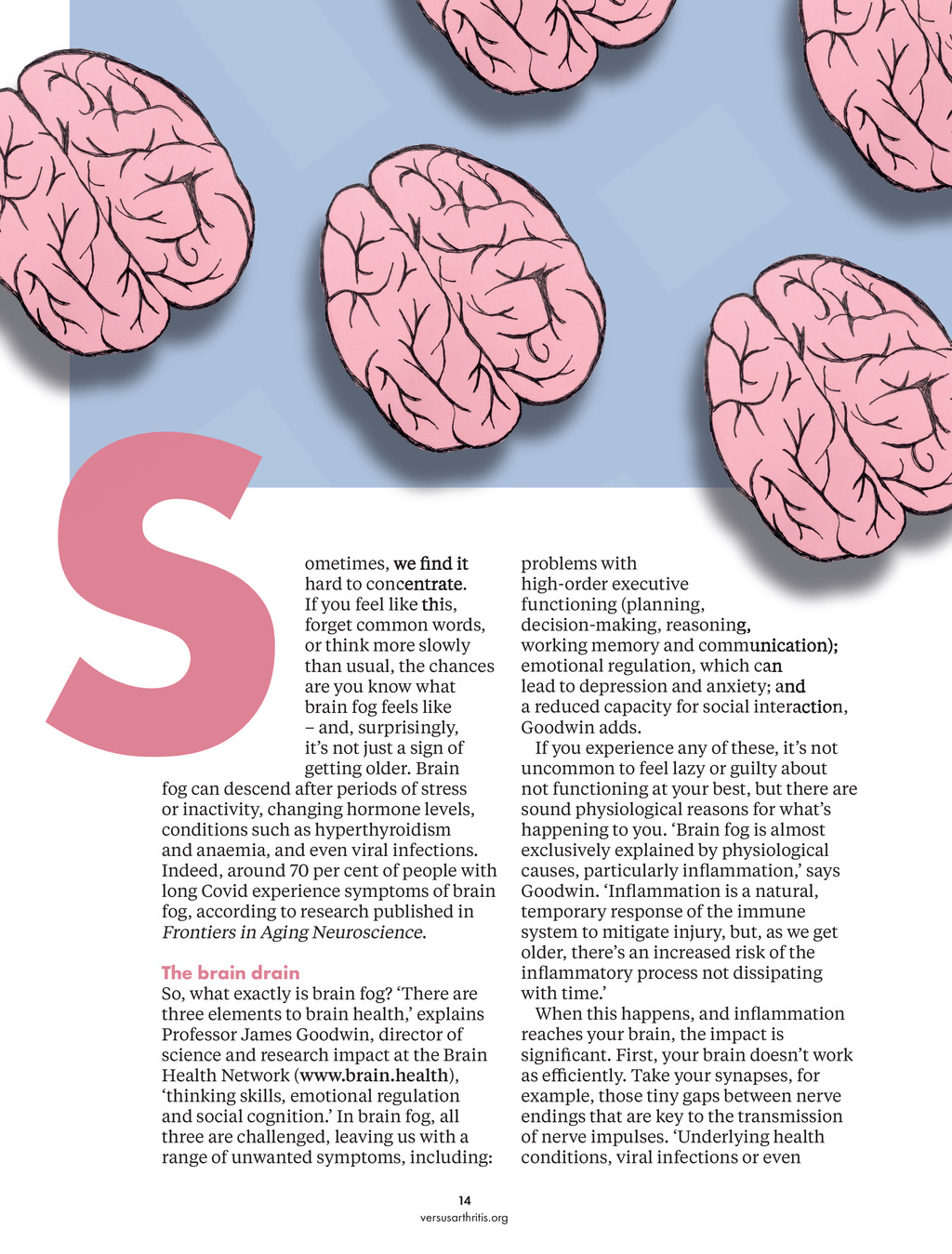 S ometimes, we find it hard to concentrate. If you feel like this, forget common words, or think more slowly than usual, the chances are you know what brain fog feels like and, surprisingly, its not just a sign of getting older. Brain fog can descend after periods of stress or inactivity, changing hormone levels, conditions such as hyperthyroidism and anaemia, and even viral infections. Indeed, around 70 per cent of people with long Covid experience symptoms of brain fog, according to research published in Frontiers in Aging Neuroscience. The brain drain So, what exactly is brain fog? There are three elements to brain health, explains Professor James Goodwin, director of science and research impact at the Brain Health Network (www.brain.health), thinking skills, emotional regulation and social cognition. In brain fog, all three are challenged, leaving us with a range of unwanted symptoms, including: problems with high-order executive functioning (planning, decision-making, reasoning, working memory and communication); emotional regulation, which can lead to depression and anxiety; and a reduced capacity for social interaction, Goodwin adds. If you experience any of these, its not uncommon to feel lazy or guilty about not functioning at your best, but there are sound physiological reasons for whats happening to you. Brain fog is almost exclusively explained by physiological causes, particularly inflammation, says Goodwin. Inflammation is a natural, temporary response of the immune system to mitigate injury, but, as we get older, theres an increased risk of the inflammatory process not dissipating with time. When this happens, and inflammation reaches your brain, the impact is significant. First, your brain doesnt work as efficiently. Take your synapses, for example, those tiny gaps between nerve endings that are key to the transmission of nerve impulses. Underlying health conditions, viral infections or even 14 versusarthritis.org PP13-15_Inspire_Summer 2023_Brain fog.indd 14 17/05/2023 12:13