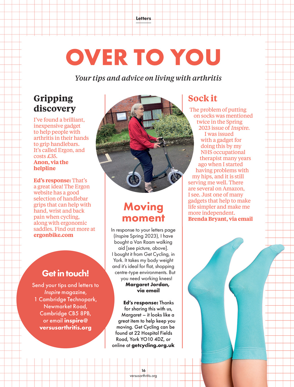 Letters OVER TO YOU Your tips and advice on living with arthritis Gripping discovery Sock it Ive found a brilliant, inexpensive gadget to help people with arthritis in their hands to grip handlebars. Its called Ergon, and costs 35. Anon, via the helpline Eds response: Thats a great idea! The Ergon website has a good selection of handlebar grips that can help with hand, wrist and back pain when cycling, along with ergonomic saddles. Find out more at ergonbike.com Get in touch! Send your tips and letters to Inspire magazine, 1 Cambridge Technopark, Newmarket Road, Cambridge CB5 8PB, or email inspire@ versusarthritis.org Moving moment The problem of putting on socks was mentioned twice in the Spring 2023 issue of Inspire. I was issued with a gadget for doing this by my NHS occupational therapist many years ago when I started having problems with my hips, and it is still serving me well. There are several on Amazon, I see. Just one of many gadgets that help to make life simpler and make me more independent. Brenda Bryant, via email In response to your letters page (Inspire Spring 2023), I have bought a Van Raam walking aid [see picture, above]. I bought it from Get Cycling, in York. It takes my body weight and its ideal for flat, shopping centre-type environments. But you need working knees! Margaret Jordan, via email Eds response: Thanks for sharing this with us, Margaret it looks like a great item to help keep you moving. Get Cycling can be found at 22 Hospital Fields Road, York YO10 4DZ, or online at getcycling.org.uk 16 versusarthritis.org PP16_Inspire_Summer 2023_Letters.indd 16 17/05/2023 12:17