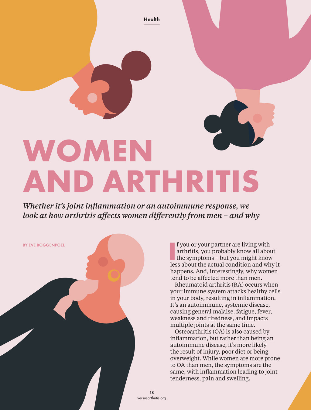 Health WOMEN AND ARTHRITIS Whether its joint inflammation or an autoimmune response, we look at how arthritis affects women differently from men and why I f you or your partner are living with arthritis, you probably know all about the symptoms but you might know less about the actual condition and why it happens. And, interestingly, why women tend to be affected more than men. Rheumatoid arthritis (RA) occurs when your immune system attacks healthy cells in your body, resulting in inflammation. Its an autoimmune, systemic disease, causing general malaise, fatigue, fever, weakness and tiredness, and impacts multiple joints at the same time. Osteoarthritis (OA) is also caused by inflammation, but rather than being an autoimmune disease, its more likely the result of injury, poor diet or being overweight. While women are more prone to OA than men, the symptoms are the same, with inflammation leading to joint tenderness, pain and swelling. BY EVE BOGGENPOEL 18 versusarthritis.org PP18-19_Inspire_Summer 2023_Women and Arthritis.indd 18 17/05/2023 12:22