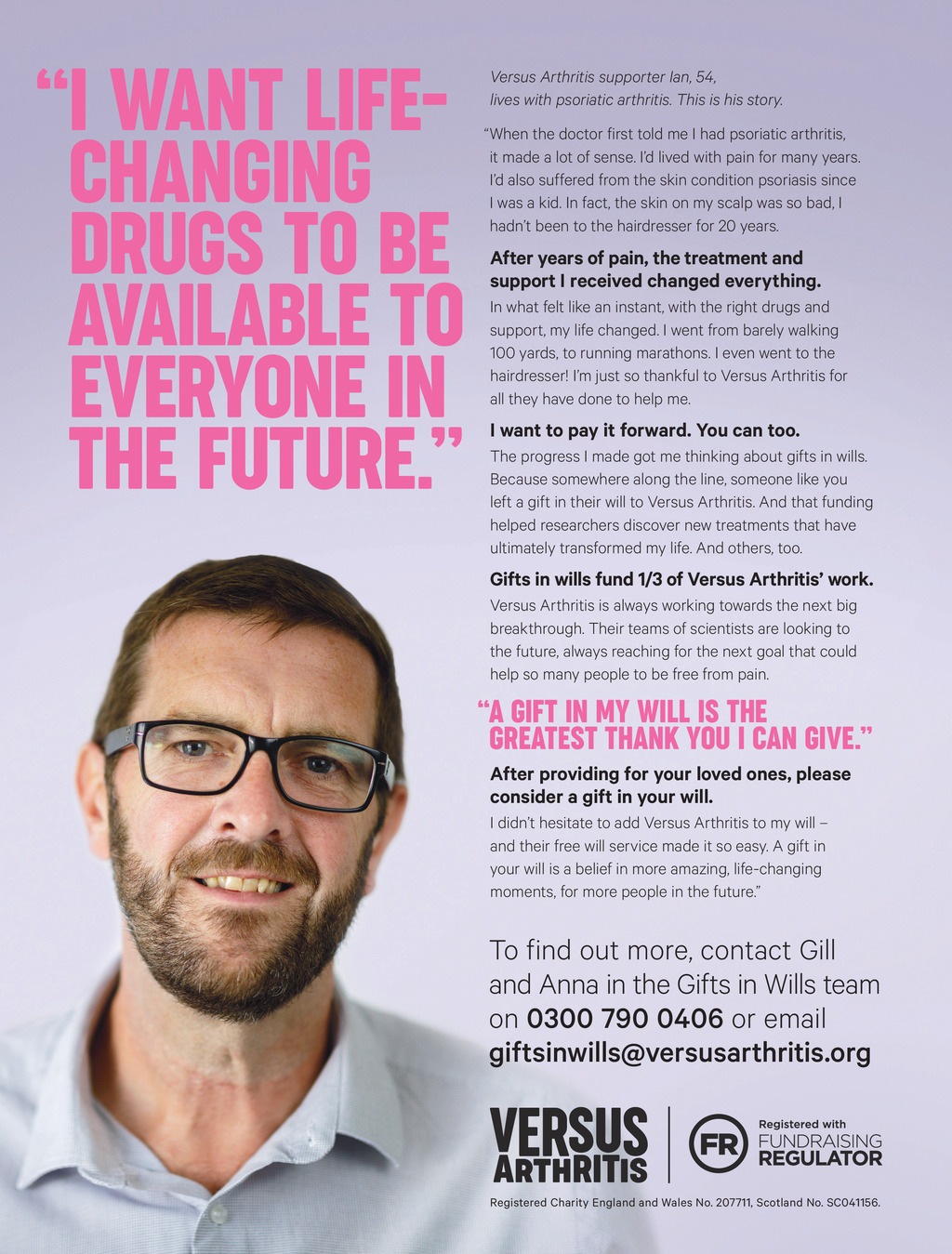 I WANT LIFECHANGING DRUGS TO BE AVAILABLE TO EVERYONE IN THE FUTURE. Versus Arthritis supporter Ian, 54, lives with psoriatic arthritis. This is his story. When the doctor first told me I had psoriatic arthritis, it made a lot of sense. Id lived with pain for many years. Id also suffered from the skin condition psoriasis since I was a kid. In fact, the skin on my scalp was so bad, I hadnt been to the hairdresser for 20 years. After years of pain, the treatment and support I received changed everything. In what felt like an instant, with the right drugs and support, my life changed. I went from barely walking 100 yards, to running marathons. I even went to the hairdresser! Im just so thankful to Versus Arthritis for all they have done to help me. I want to pay it forward. You can too. The progress I made got me thinking about gifts in wills. Because somewhere along the line, someone like you left a gift in their will to Versus Arthritis. And that funding helped researchers discover new treatments that have ultimately transformed my life. And others, too. Gifts in wills fund 1/3 of Versus Arthritis work. Versus Arthritis is always working towards the next big breakthrough. Their teams of scientists are looking to the future, always reaching for the next goal that could help so many people to be free from pain. A GIFT IN MY WILL IS THE GREATEST THANK YOU I CAN GIVE. After providing for your loved ones, please consider a gift in your will. I didnt hesitate to add Versus Arthritis to my will and their free will service made it so easy. A gift in your will is a belief in more amazing, life-changing moments, for more people in the future. To find out more, contact Gill and Anna in the Gifts in Wills team on 0300 790 0406 or email giftsinwills@versusarthritis.org Registered Charity England and Wales No. 207711, Scotland No. SC041156. PP03_Inspire_Summer 2023_Welcome.indd 2 17/05/2023 11:57