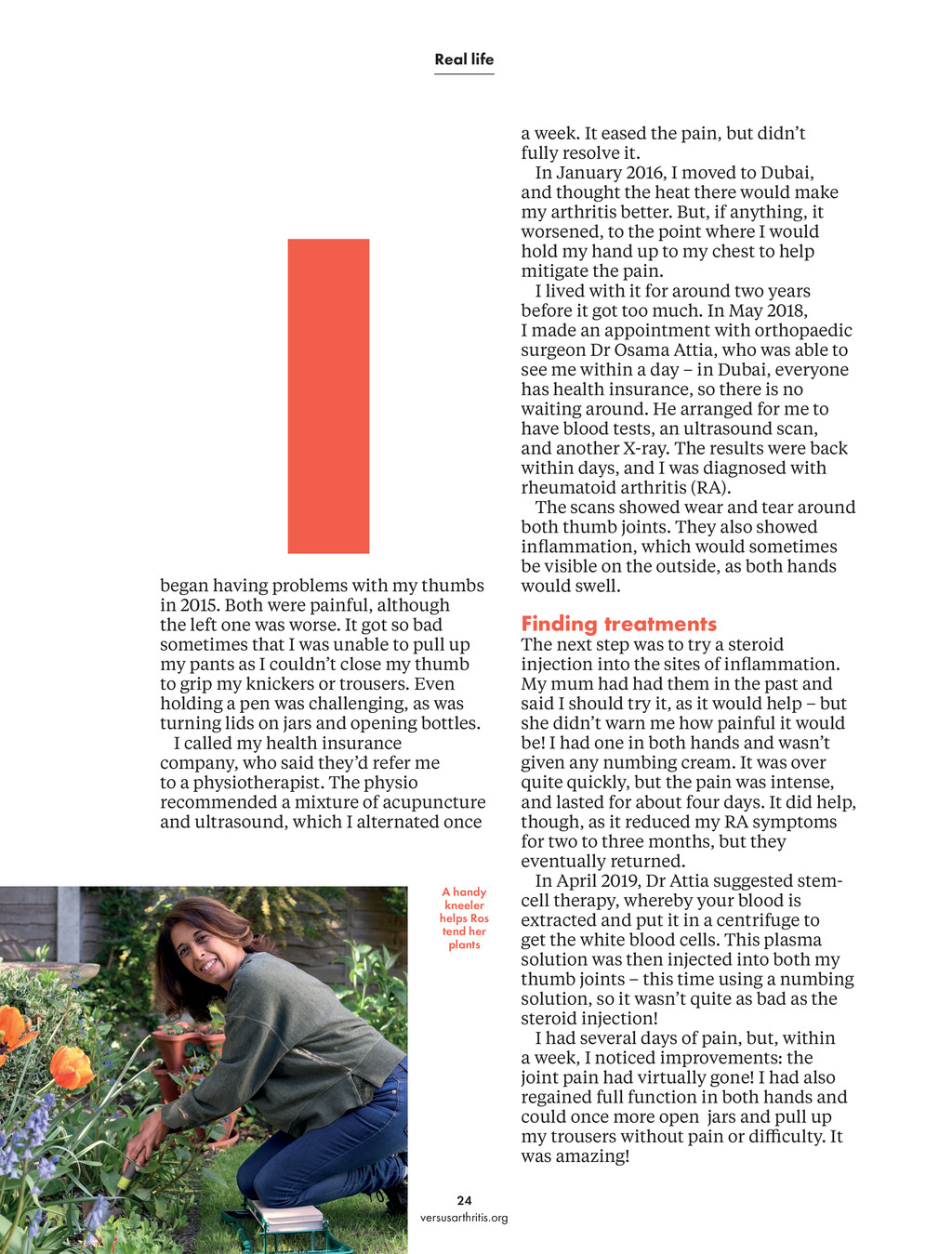 Real life I began having problems with my thumbs in 2015. Both were painful, although the left one was worse. It got so bad sometimes that I was unable to pull up my pants as I couldnt close my thumb to grip my knickers or trousers. Even holding a pen was challenging, as was turning lids on jars and opening bottles. I called my health insurance company, who said theyd refer me to a physiotherapist. The physio recommended a mixture of acupuncture and ultrasound, which I alternated once A handy kneeler helps Ros tend her plants a week. It eased the pain, but didnt fully resolve it. In January 2016, I moved to Dubai, and thought the heat there would make my arthritis better. But, if anything, it worsened, to the point where I would hold my hand up to my chest to help mitigate the pain. I lived with it for around two years before it got too much. In May 2018, I made an appointment with orthopaedic surgeon Dr Osama Attia, who was able to see me within a day in Dubai, everyone has health insurance, so there is no waiting around. He arranged for me to have blood tests, an ultrasound scan, and another X-ray. The results were back within days, and I was diagnosed with rheumatoid arthritis (RA). The scans showed wear and tear around both thumb joints. They also showed inflammation, which would sometimes be visible on the outside, as both hands would swell. Finding treatments The next step was to try a steroid injection into the sites of inflammation. My mum had had them in the past and said I should try it, as it would help but she didnt warn me how painful it would be! I had one in both hands and wasnt given any numbing cream. It was over quite quickly, but the pain was intense, and lasted for about four days. It did help, though, as it reduced my RA symptoms for two to three months, but they eventually returned. In April 2019, Dr Attia suggested stemcell therapy, whereby your blood is extracted and put it in a centrifuge to get the white blood cells. This plasma solution was then injected into both my thumb joints this time using a numbing solution, so it wasnt quite as bad as the steroid injection! I had several days of pain, but, within a week, I noticed improvements: the joint pain had virtually gone! I had also regained full function in both hands and could once more open jars and pull up my trousers without pain or difficulty. It was amazing! 24 versusarthritis.org PP22-25_Inspire_Summer 2023_Real life.indd 24 17/05/2023 16:01