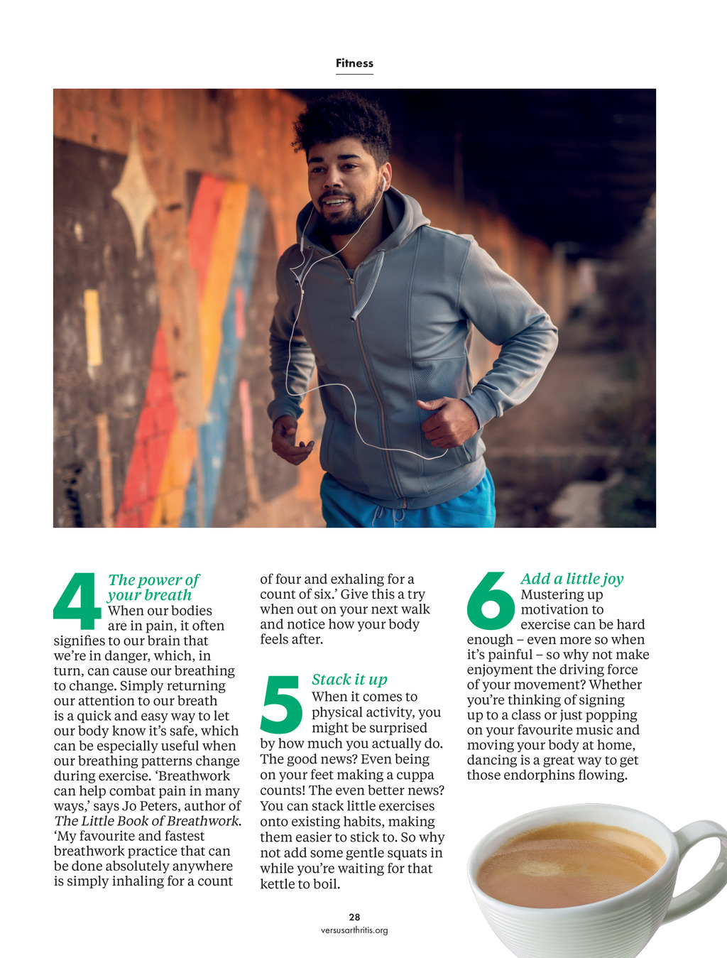Fitness 4 The power of your breath When our bodies are in pain, it often signifies to our brain that were in danger, which, in turn, can cause our breathing to change. Simply returning our attention to our breath is a quick and easy way to let our body know its safe, which can be especially useful when our breathing patterns change during exercise. Breathwork can help combat pain in many ways, says Jo Peters, author of The Little Book of Breathwork. My favourite and fastest breathwork practice that can be done absolutely anywhere is simply inhaling for a count of four and exhaling for a count of six. Give this a try when out on your next walk and notice how your body feels after. 5 Stack it up When it comes to physical activity, you might be surprised by how much you actually do. The good news? Even being on your feet making a cuppa counts! The even better news? You can stack little exercises onto existing habits, making them easier to stick to. So why not add some gentle squats in while youre waiting for that kettle to boil. 6 Add a little joy Mustering up motivation to exercise can be hard enough even more so when its painful so why not make enjoyment the driving force of your movement? Whether youre thinking of signing up to a class or just popping on your favourite music and moving your body at home, dancing is a great way to get those endorphins flowing. 28 versusarthritis.org PP26-28_Inspire_Summer 2023_Mental Fitness.indd 28 17/05/2023 12:30