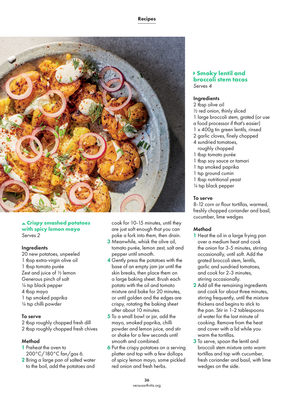 Recipes Smoky lentil and broccoli stem tacos Serves 4 Ingredients 2 tbsp olive oil red onion, thinly sliced 1 large broccoli stem, grated (or use a food processor if that s easier) 1 x 400g tin green lentils, rinsed 2 garlic cloves, finely chopped 4 sundried tomatoes, roughly chopped 1 tbsp tomato pure 1 tbsp soy sauce or tamari 1 tsp smoked paprika 1 tsp ground cumin 1 tbsp nutritional yeast tsp black pepper Crispy smashed potatoes with spicy lemon mayo Serves 2 Ingredients 20 new potatoes, unpeeled 1 tbsp extra-virgin olive oil 1 tbsp tomato pure Zest and juice of lemon Generous pinch of salt tsp black pepper 4 tbsp mayo 1 tsp smoked paprika tsp chilli powder To serve 2 tbsp roughly chopped fresh dill 2 tbsp roughly chopped fresh chives Method 1 Preheat the oven to 200C/180C fan/gas 6. 2 Bring a large pan of salted water to the boil, add the potatoes and cook for 10-15 minutes, until they are just soft enough that you can poke a fork into them, then drain. 3 Meanwhile, whisk the olive oil, tomato pure, lemon zest, salt and pepper until smooth. 4 Gently press the potatoes with the base of an empty jam jar until the skin breaks, then place them on a large baking sheet. Brush each potato with the oil and tomato mixture and bake for 20 minutes, or until golden and the edges are crispy, rotating the baking sheet after about 10 minutes. 5 To a small bowl or jar, add the mayo, smoked paprika, chilli powder and lemon juice, and stir or shake for a few seconds until smooth and combined. 6 Put the crispy potatoes on a serving platter and top with a few dollops of spicy lemon mayo, some pickled red onion and fresh herbs. To serve 8-12 corn or flour tortillas, warmed, freshly chopped coriander and basil, cucumber, lime wedges Method 1 Heat the oil in a large frying pan over a medium heat and cook the onion for 3-5 minutes, stirring occasionally, until soft. Add the grated broccoli stem, lentils, garlic and sundried tomatoes, and cook for 2-3 minutes, stirring occasionally. 2 Add all the remaining ingredients and cook for about three minutes, stirring frequently, until the mixture thickens and begins to stick to the pan. Stir in 1-2 tablespoons of water for the last minute of cooking. Remove from the heat and cover with a lid while you warm the tortillas. 3 To serve, spoon the lentil and broccoli stem mixture onto warm tortillas and top with cucumber, fresh coriander and basil, with lime wedges on the side. 36 versusarthritis.org PP35-38_Inspire_Summer 2023_Recipes.indd 36 17/05/2023 13:37