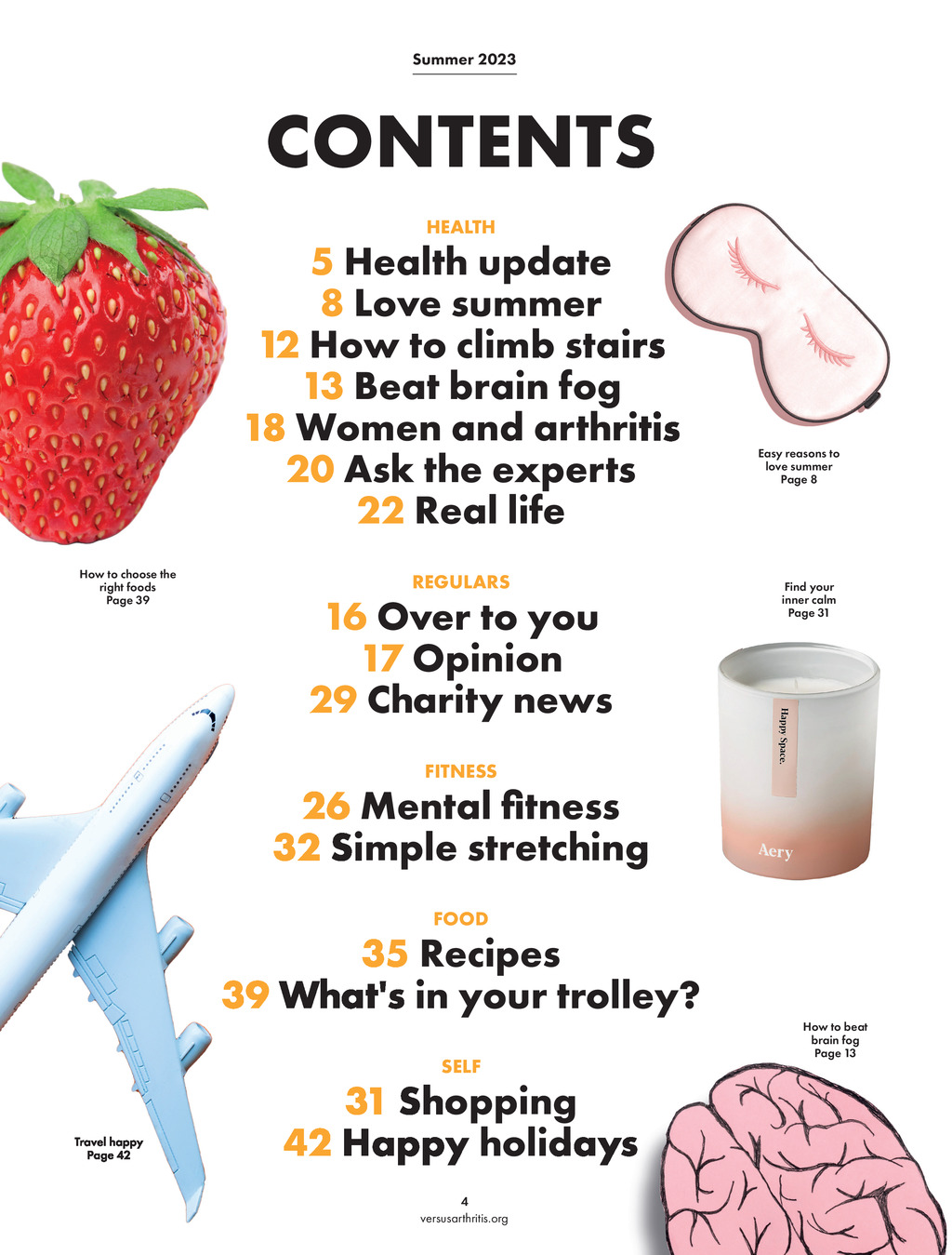 Summer 2023 CONTENTS HEALTH 5 Health update 8 Love summer 12 How to climb stairs 13 Beat brain fog 18 Women and arthritis 20 Ask the experts 22 Real life How to choose the right foods Page 39 REGULARS 16 Over to you 17 Opinion 29 Charity news Easy reasons to love summer Page 8 Find your inner calm Page 31 FITNESS 26 Mental fitness 32 Simple stretching FOOD 35 Recipes 39 What s in your trolley? SELF Travel happy Page 42 How to beat brain fog Page 13 31 Shopping 42 Happy holidays 4 versusarthritis.org PP04_Inspire_Summer 2023_Contents.indd 4 17/05/2023 11:58