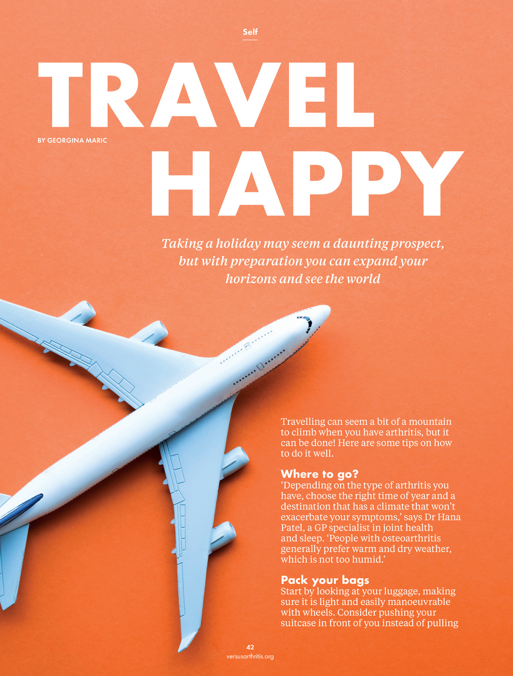 Self BY GEORGINA MARIC Taking a holiday may seem a daunting prospect, but with preparation you can expand your horizons and see the world Travelling can seem a bit of a mountain to climb when you have arthritis, but it can be done! Here are some tips on how to do it well. Where to go? Depending on the type of arthritis you have, choose the right time of year and a destination that has a climate that wont exacerbate your symptoms, says Dr Hana Patel, a GP specialist in joint health and sleep. People with osteoarthritis generally prefer warm and dry weather, which is not too humid. Pack your bags Start by looking at your luggage, making sure it is light and easily manoeuvrable with wheels. Consider pushing your suitcase in front of you instead of pulling 42 versusarthritis.org PP42-43_Inspire_Summer 2023_Travel Well.indd 42 17/05/2023 16:07
