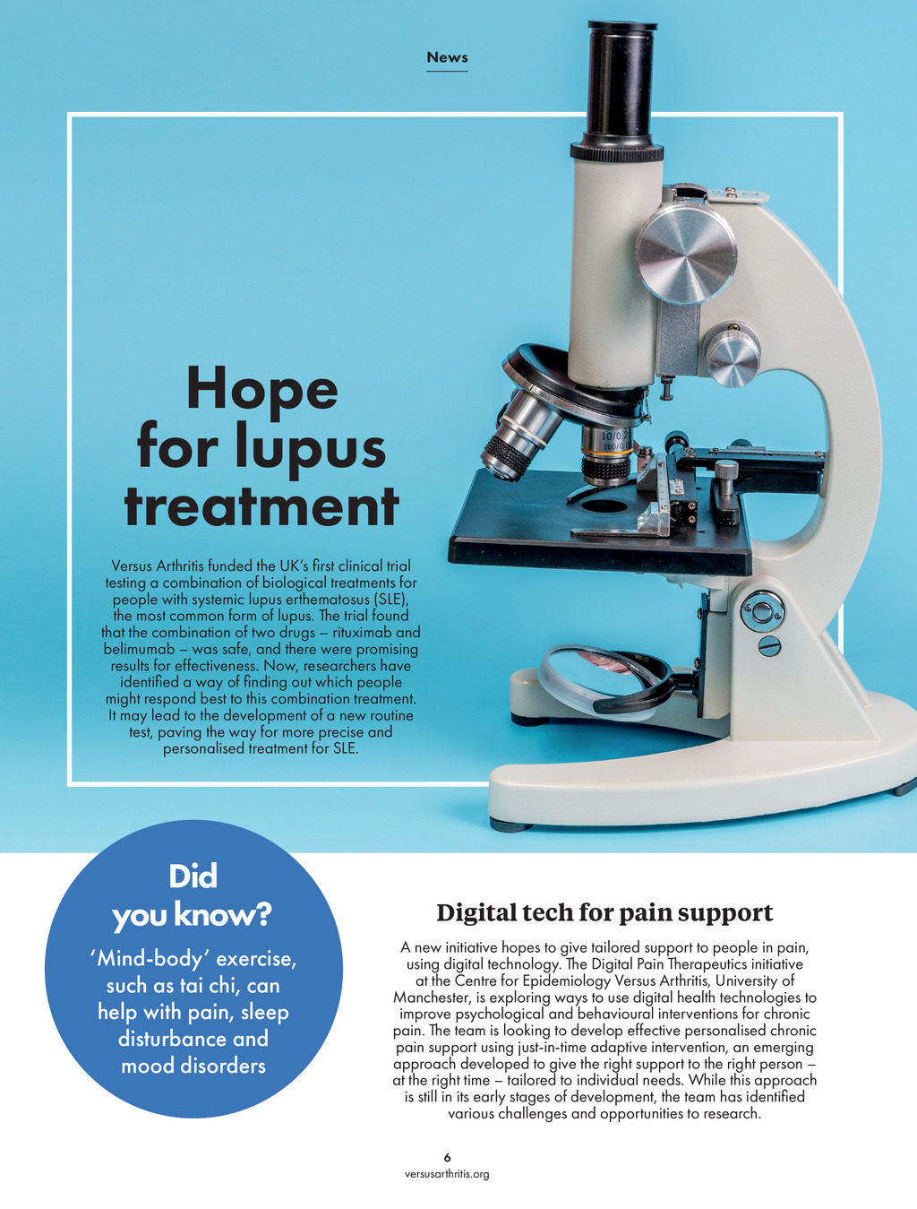 News Hope for lupus treatment Versus Arthritis funded the UKs first clinical trial testing a combination of biological treatments for people with systemic lupus erthematosus (SLE), the most common form of lupus. The trial found that the combination of two drugs rituximab and belimumab was safe, and there were promising results for effectiveness. Now, researchers have identified a way of finding out which people might respond best to this combination treatment. It may lead to the development of a new routine test, paving the way for more precise and personalised treatment for SLE. Did you know? Mind-body exercise, such as tai chi, can help with pain, sleep disturbance and mood disorders Digital tech for pain support A new initiative hopes to give tailored support to people in pain, using digital technology. The Digital Pain Therapeutics initiative at the Centre for Epidemiology Versus Arthritis, University of Manchester, is exploring ways to use digital health technologies to improve psychological and behavioural interventions for chronic pain. The team is looking to develop effective personalised chronic pain support using just-in-time adaptive intervention, an emerging approach developed to give the right support to the right person at the right time tailored to individual needs. While this approach is still in its early stages of development, the team has identified various challenges and opportunities to research. 6 versusarthritis.org PP05-07_Inspire_Summer 2023_Health News.indd 6 17/05/2023 12:01