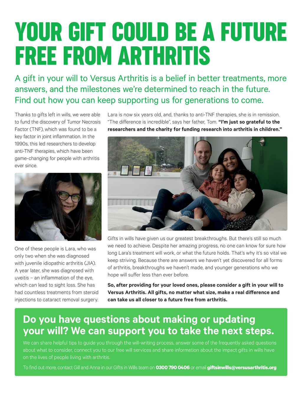 Your gift could be a future free from arthritis A gift in your will to Versus Arthritis is a belief in better treatments, more answers, and the milestones were determined to reach in the future. Find out how you can keep supporting us for generations to come. Thanks to gifts left in wills, we were able to fund the discovery of Tumor Necrosis Factor (TNF), which was found to be a key factor in joint inflammation. In the 1990s, this led researchers to develop anti-TNF therapies, which have been game-changing for people with arthritis ever since. One of these people is Lara, who was only two when she was diagnosed with juvenile idiopathic arthritis (JIA). A year later, she was diagnosed with uveitis an inflammation of the eye, which can lead to sight loss. She has had countless treatments from steroid injections to cataract removal surgery. Lara is now six years old, and, thanks to anti-TNF therapies, she is in remission. The difference is incredible, says her father, Tom. Im just so grateful to the researchers and the charity for funding research into arthritis in children. Gifts in wills have given us our greatest breakthroughs. But theres still so much we need to achieve. Despite her amazing progress, no one can know for sure how long Laras treatment will work, or what the future holds. Thats why its so vital we keep striving. Because there are answers we havent yet discovered for all forms of arthritis, breakthroughs we havent made, and younger generations who we hope will suffer less than ever before. So, after providing for your loved ones, please consider a gift in your will to Versus Arthritis. All gifts, no matter what size, make a real difference and can take us all closer to a future free from arthritis. Do you have questions about making or updating your will? We can support you to take the next steps. We can share helpful tips to guide you through the will-writing process, answer some of the frequently asked questions about what to consider, connect you to our free will services and share information about the impact gifts in wills have on the lives of people living with arthritis. To find out more, contact Gill and Anna in our Gifts in Wills team on 0300 790 0406 or email giftsinwills@versusarthritis.org PP02-03_Inspire_Winter 2023_Welcome.indd 2 14/11/2023 11:31