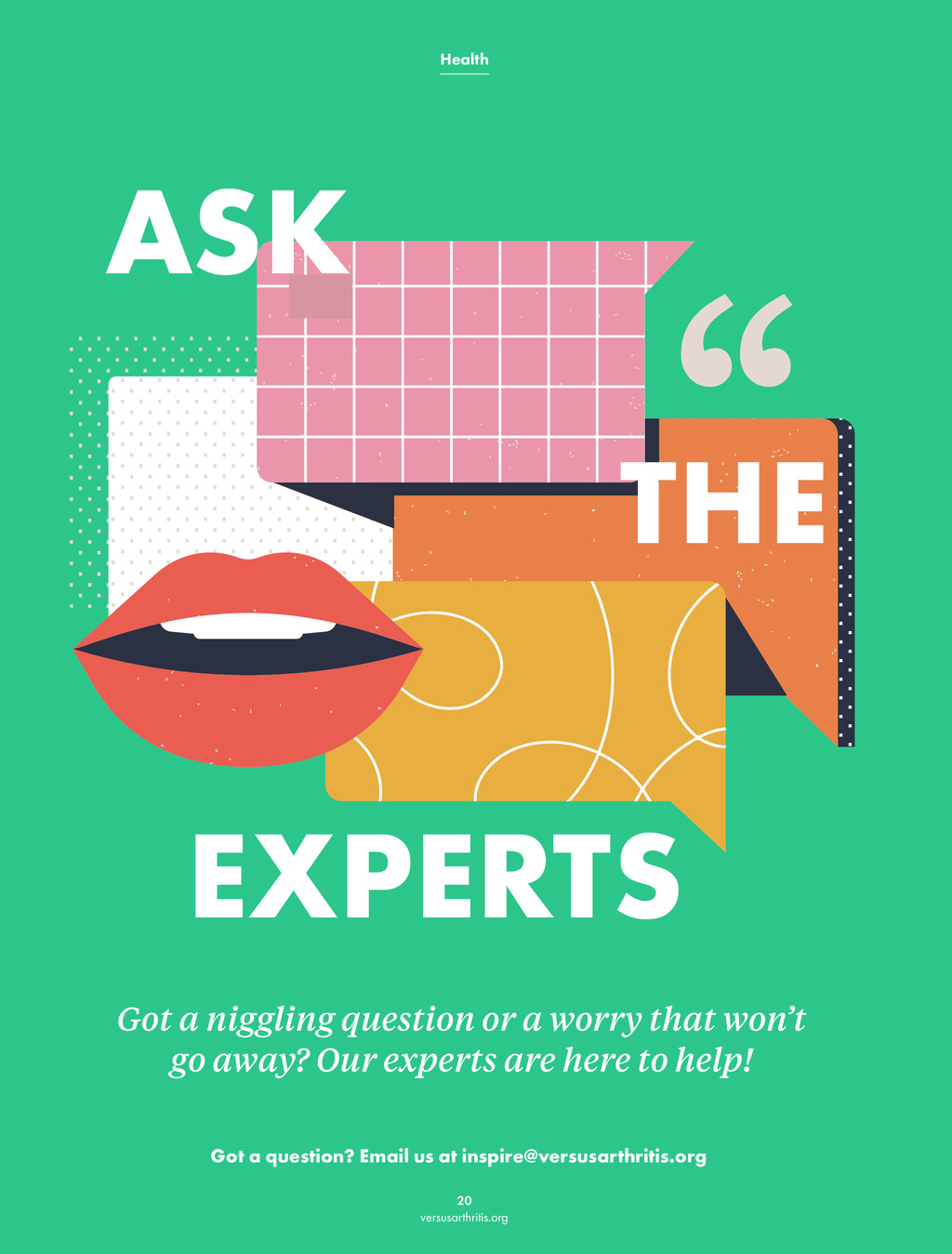 Health ASK THE EXPERTS Got a niggling question or a worry that wont go away? Our experts are here to help! Got a question? Email us at inspire@versusarthritis.org 20 versusarthritis.org PP20-21_Inspire_Winter 2023_Ask the experts.indd 20 14/11/2023 11:51