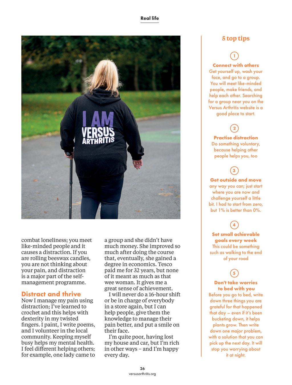 Real life 5 top tips 1 Connect with others Get yourself up, wash your face, and go to a group. You will meet like-minded people, make friends, and help each other. Searching for a group near you on the Versus Arthritis website is a good place to start. 2 Practise distraction Do something voluntary, because helping other people helps you, too 3 Get outside and move any way you can; just start where you are now and challenge yourself a little bit. I had to start from zero, but 1% is better than 0%. 4 combat loneliness; you meet like-minded people and it causes a distraction. If you are rolling beeswax candles, you are not thinking about your pain, and distraction is a major part of the selfmanagement programme. Distract and thrive Now I manage my pain using distraction; Ive learned to crochet and this helps with dexterity in my twisted fingers. I paint, I write poems, and I volunteer in the local community. Keeping myself busy helps my mental health. I feel different helping others; for example, one lady came to a group and she didnt have much money. She improved so much after doing the course that, eventually, she gained a degree in economics. Tesco paid me for 32 years, but none of it meant as much as that wee woman. It gives me a great sense of achievement. I will never do a 16-hour shift or be in charge of everybody in a store again, but I can help people, give them the knowledge to manage their pain better, and put a smile on their face. Im quite poor, having lost my house and car, but Im rich in other ways and Im happy every day. Set small achievable goals every week This could be something such as walking to the end of your road 5 Don t take worries to bed with you Before you go to bed, write down three things you are grateful for that happened that day even if its been bucketing down, it helps plants grow. Then write down one major problem, with a solution that you can pick up the next day. It will stop you worrying about it at night. 26 versusarthritis.org PP22-26_Inspire_Winter 2023_Real life.indd 26 14/11/2023 12:06
