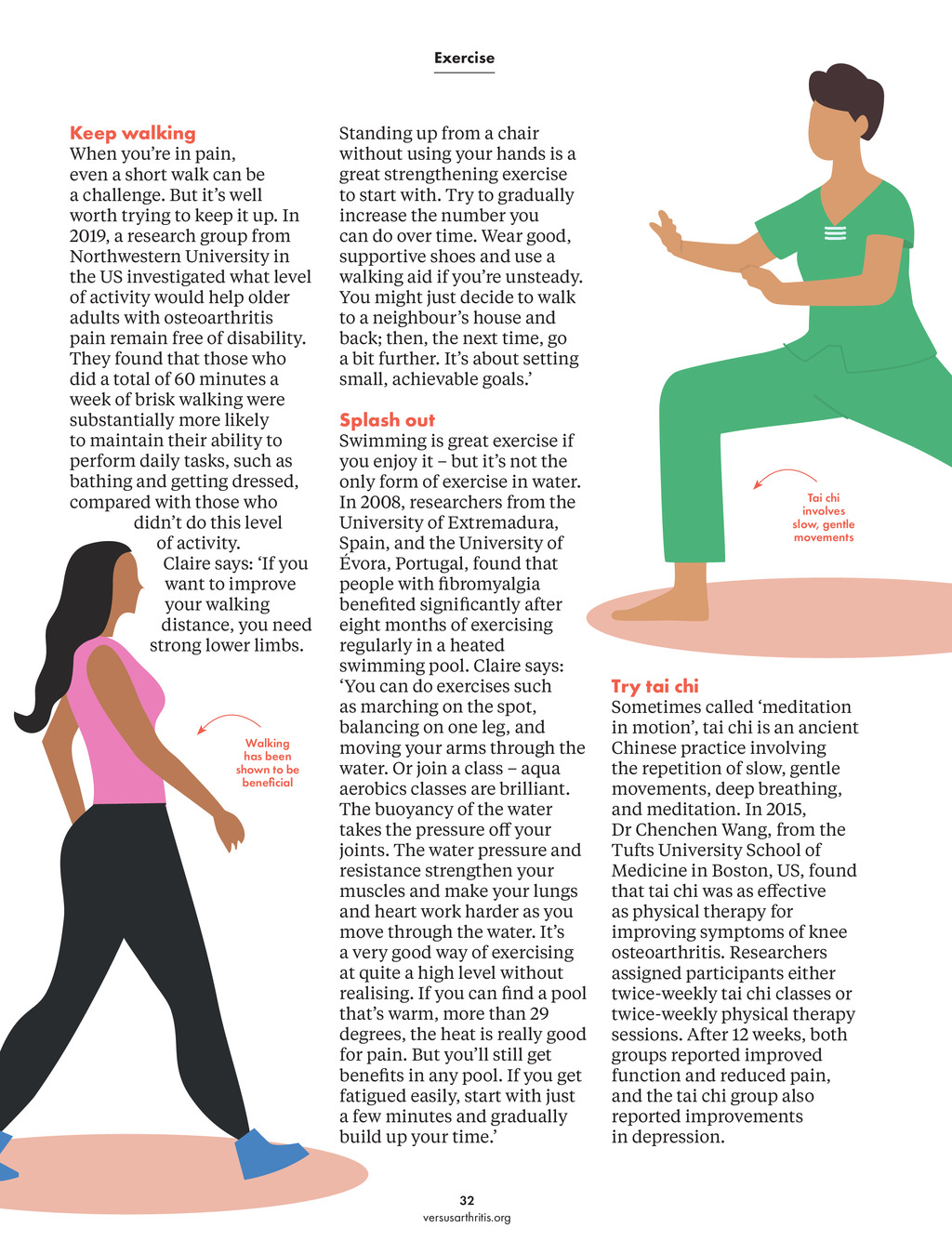 Exercise Keep walking When youre in pain, even a short walk can be a challenge. But its well worth trying to keep it up. In 2019, a research group from Northwestern University in the US investigated what level of activity would help older adults with osteoarthritis pain remain free of disability. They found that those who did a total of 60 minutes a week of brisk walking were substantially more likely to maintain their ability to perform daily tasks, such as bathing and getting dressed, compared with those who didnt do this level of activity. Claire says: If you want to improve your walking distance, you need strong lower limbs. Walking has been shown to be beneficial Standing up from a chair without using your hands is a great strengthening exercise to start with. Try to gradually increase the number you can do over time. Wear good, supportive shoes and use a walking aid if youre unsteady. You might just decide to walk to a neighbours house and back; then, the next time, go a bit further. Its about setting small, achievable goals. Splash out Swimming is great exercise if you enjoy it but its not the only form of exercise in water. In 2008, researchers from the University of Extremadura, Spain, and the University of vora, Portugal, found that people with fibromyalgia benefited significantly after eight months of exercising regularly in a heated swimming pool. Claire says: You can do exercises such as marching on the spot, balancing on one leg, and moving your arms through the water. Or join a class aqua aerobics classes are brilliant. The buoyancy of the water takes the pressure off your joints. The water pressure and resistance strengthen your muscles and make your lungs and heart work harder as you move through the water. Its a very good way of exercising at quite a high level without realising. If you can find a pool thats warm, more than 29 degrees, the heat is really good for pain. But youll still get benefits in any pool. If you get fatigued easily, start with just a few minutes and gradually build up your time. Tai chi involves slow, gentle movements Try tai chi Sometimes called meditation in motion, tai chi is an ancient Chinese practice involving the repetition of slow, gentle movements, deep breathing, and meditation. In 2015, Dr Chenchen Wang, from the Tufts University School of Medicine in Boston, US, found that tai chi was as effective as physical therapy for improving symptoms of knee osteoarthritis. Researchers assigned participants either twice-weekly tai chi classes or twice-weekly physical therapy sessions. After 12 weeks, both groups reported improved function and reduced pain, and the tai chi group also reported improvements in depression. 32 versusarthritis.org PP30-32_Inspire_Winter 2023_Exercises.indd 32 14/11/2023 12:01